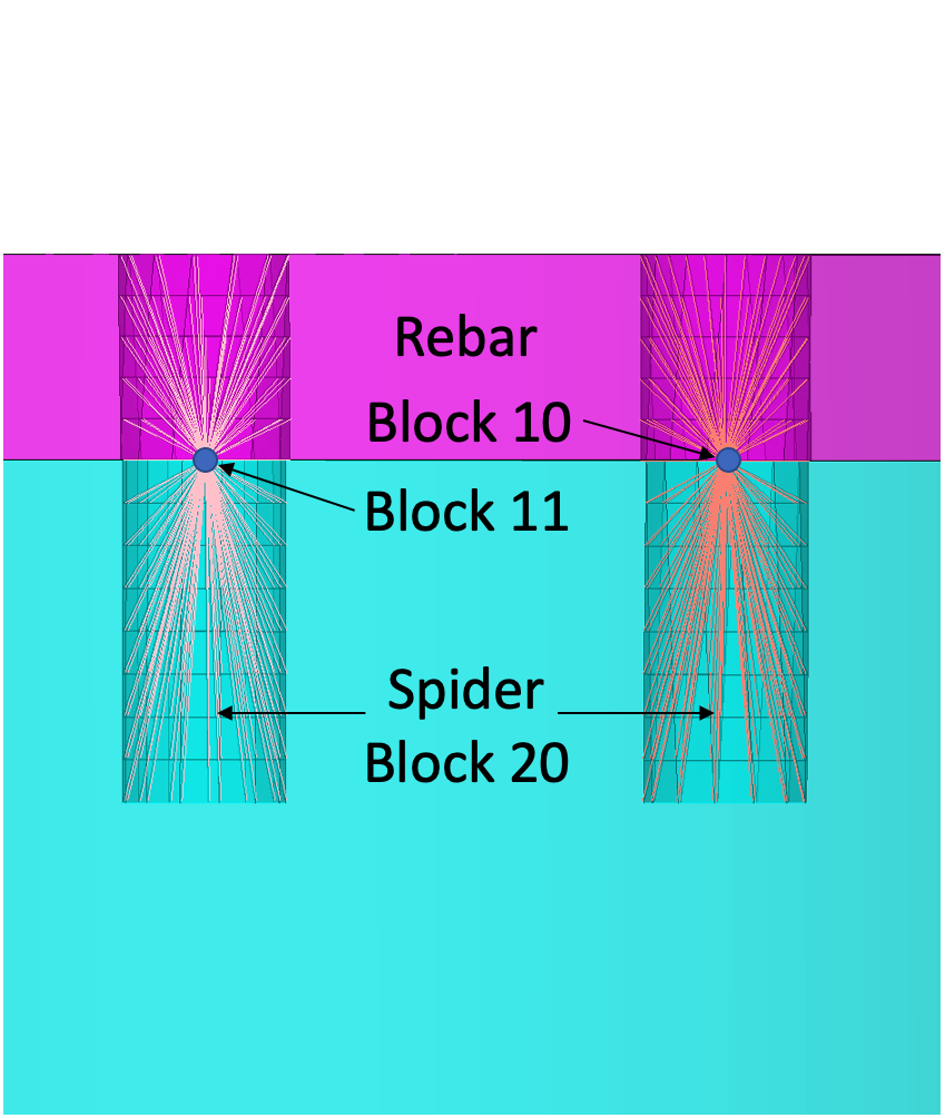 The spider and rebar blocks may be defined by either a block_name or block_id. If the block does not yet exist, a new one will be created. The Default option will automatically select an id or name. The default names for the spider and rebar blocks are Spider_Block and Rebar_Block respectively.When building new blocks for each bolt volume, the block IDs can be automatically generated by incrementing from a specified block_id. The increment_spider_block_id and increment_rebar_block_id options are used for this prupose. For example, if rebar_block_id is defined as 100, and the increment_rebar_block_ids option is used, each new rebar generated will be assigned to a new unique block id starting with 100, followed by 101, 102, 103, etc.