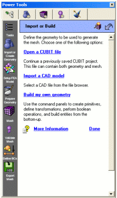 In other cases, the list of tasks is a presents a list of choices, from which you will only select one option. The Import Geometry Page shown below is such an example. It gives a list of different geometry import/creation options and you just select one of the alternatives.