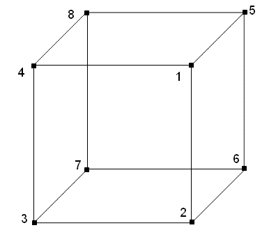Using the nodes specified, this form of the command creates a new hex or tet that will be owned by the specified volume. For a hex, 8 nodes are required. The order in which the nodes are specified is very important. They should describe two opposing faces of the hex; the normal of the first face should point into the hex and the normal of the second face should point out of the hex. For example, to create the hex shown in Figure 1 below, the following command would be entered:
