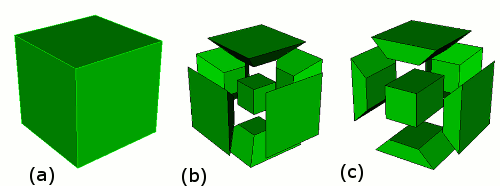 Figure 1: A single hex before (a) and after (b) a pillow operation. The far right (c) depicts a pillow operation with the front surface designated as a 'through' surface.