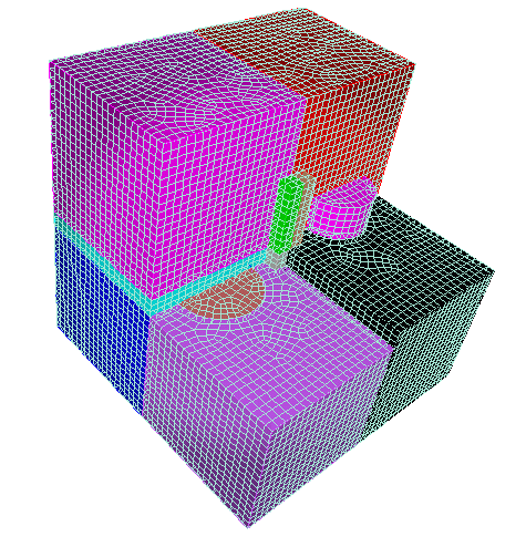 The model shown in the following figure was meshed using these three commands (part of the model is not shown to reveal the internal structure of the model).