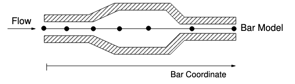 A bar model coordinate system facilitates user specification of the flow section properties. Here the bar coordinate system can be aligned with one of a Cartesian coordinate X,Y,Z directions. Optional use of an S coordinate system tied directly to the bar discretization enables modeling of flow along a circuitous path. Entrance length effects are supported for a limited number of empirical correlations. By default, influence of the entrance length effect is aligned with the bar model coordinates. Cases in which these effects are significant only over a portion of the flow can be modeled using an offset of the bar model coordinate (a schematic of this is shown in Fig. 4.17).