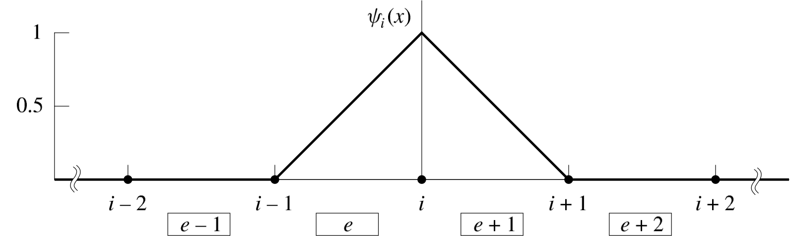To elaborate, consider Fig. 3.10, which shows a one-dimensional domain partitioned into four finite elements. In Fig. 3.11, the global, piecewise linear basis function for node i, , is shown as the standard hat function. This function has a value of unity at node i and zero in elements not connected to node i. The finite element approach to constructing