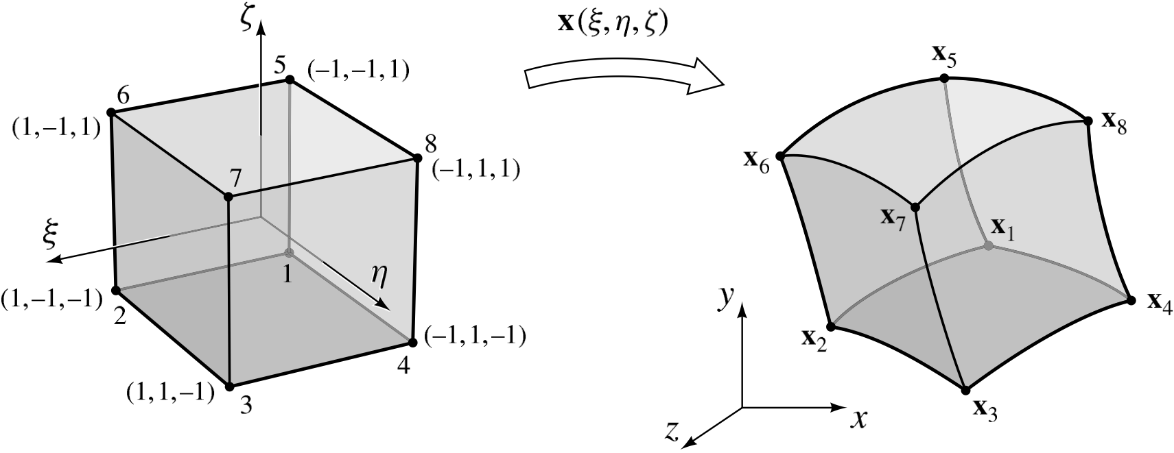 Fig. 3.14 shows the topology of the eight-node, linear hexahedral master element.