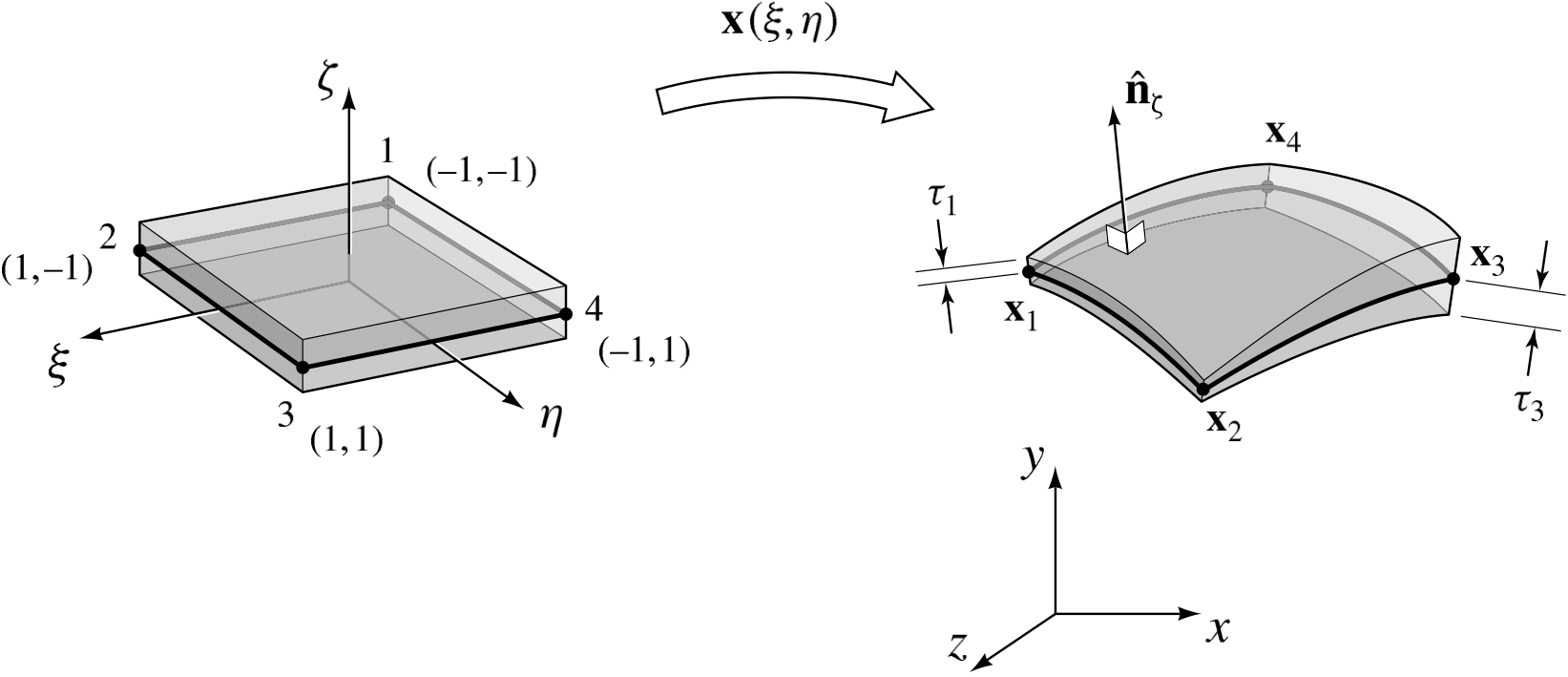 The three-dimensional, linear, quadrilateral shell element is, in principle, no different from the triangular shell element which we discussed in 3D Triangular Shell Element. As illustrated in Fig. 3.16, the quadrilateral shell has four nodes, instead of three, with the basis functions given in (3.178). The transformation from computational coordinates to physical coordinates is again given by (3.186), but with , and the