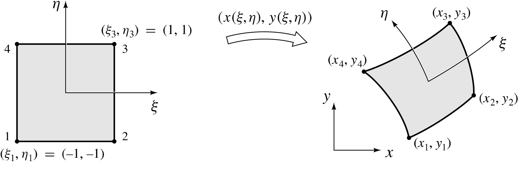 Element integrals of the form given by (3.169) are defined on the element coordinates in physical space. When calculating these quantities numerically, it is convenient to transform these integrals from physical space to a reference element, also called a master element, in parametric space. This transformation is performed locally, for each finite element in the mesh. In this section we discuss the details of this process for two-dimensional physical space in Cartesian coordinates. The approach is completely general, and extensible to three-dimensional space and other coordinate systems. This situation is illustrated in Fig. 3.12, showing such a transformation from the quadrilateral element, which spans the region , in parametric coordinates