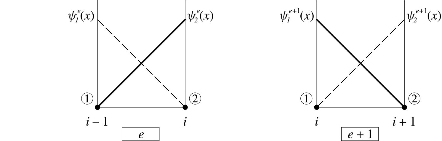 Fig. 3.10 A linear finite element global basis function at a node is formed from the nodal shape functions of two neighboring elements. The global basis function for node has support over the two elements