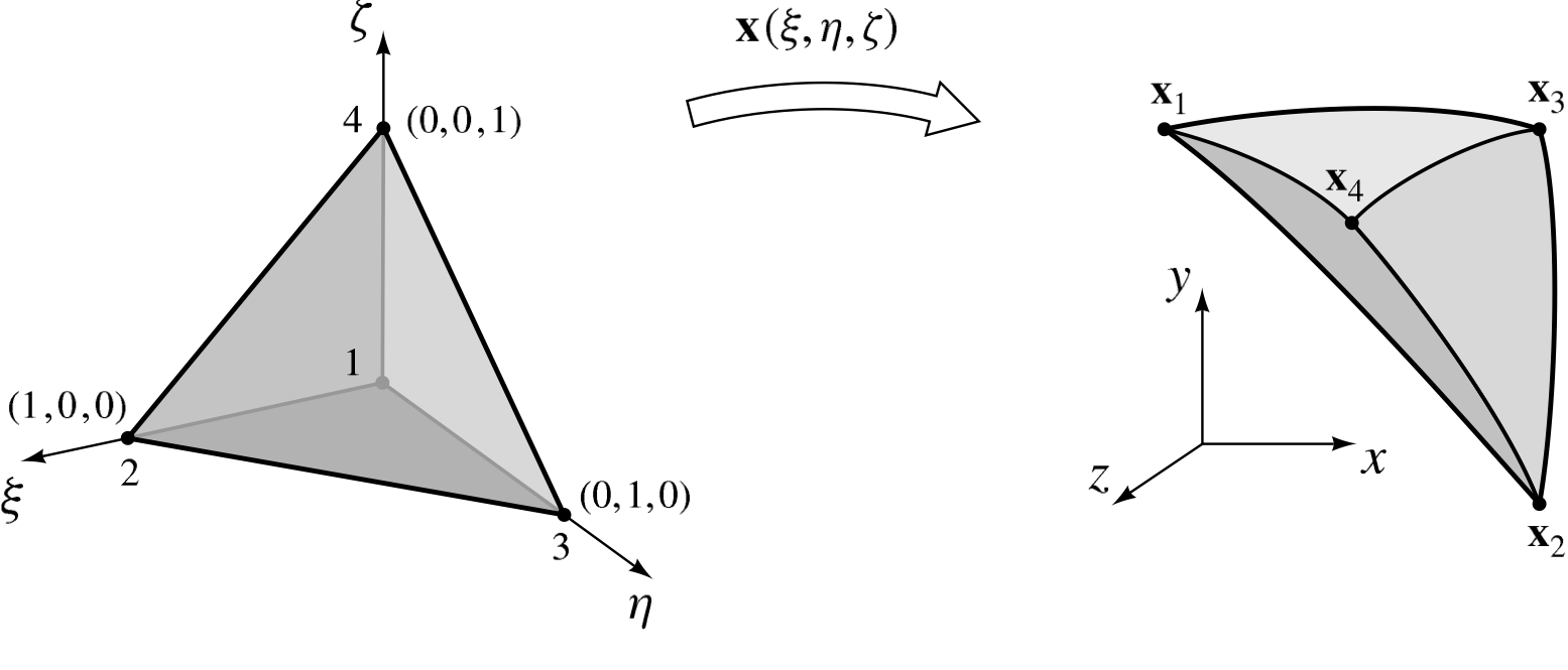 Fig. 3.13 The master tetrahedron element is mapped to its image in physical coordinates .