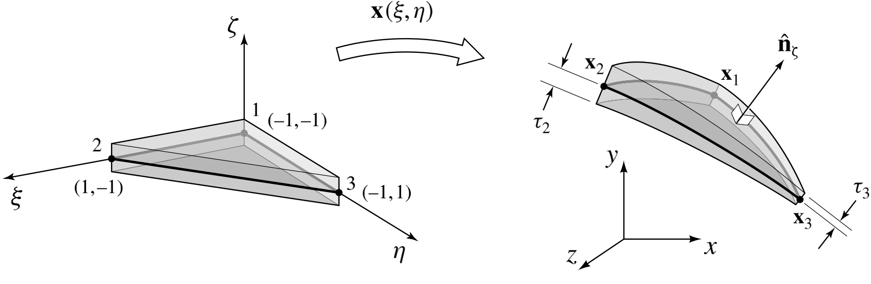 Fig. 3.15 The midplane of the master triangular shell element is mapped to its image in physical coordinates , and the variation in the shell thickness is represented with the element shape functions.
