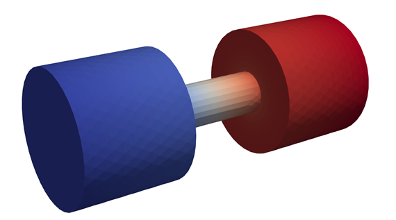 The geometry we will use for this demonstration consists of three cylinders making a dumbbell shape, with three separate named blocks (ClampA, ClampB, and CenterRod). Blocks (volumetric sections in the mesh) are used in Aria to define different material properties, and can also be used to run post-processors on.