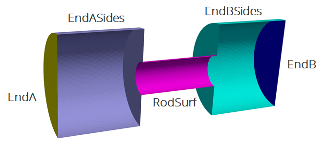 The problem also includes five separate named sidesets (EndA, EndB, EndASides, EndBSides, and RodSurf) applied on different surfaces of the mesh. Sidesets in aria are used to apply boundary conditions or do surface post-processing. Any surface not covered by a sideset will be treated as adiabatic, as will any sideset with no boundary condition applied to it.