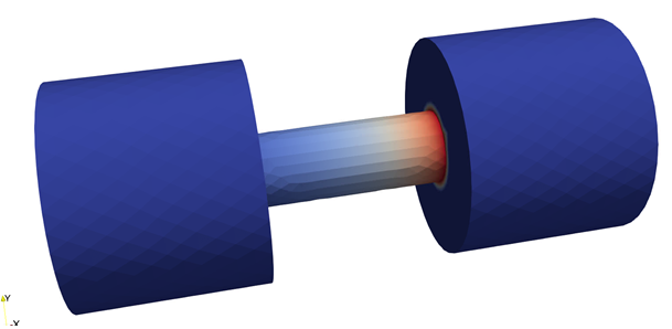 The geometry we will use for this tutorial is the same as the one used Basic Heat Conduction. It consists of three cylinders making a dumbbell shape, with three separate named blocks (ClampA, ClampB, and CenterRod). Blocks (volumetric sections in the mesh) are used in Aria to define different material properties, and can also be used to run post-processors on.