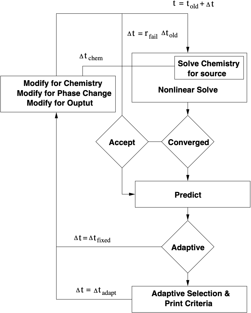Certain model features (e.g. Chemistry) will require that the behavior within the current time step be considered when advancing the time step. When adaptive time step selection is used, the subcycled chemistry timestep cannot be included directly in the adaptive time step selection as the chemistry time step will seldom satisfy the time step criteria. Here the minimum subcycled chemistry time step is modified to be comparable with other adaptive time step criteria. See Chemistry for more information.