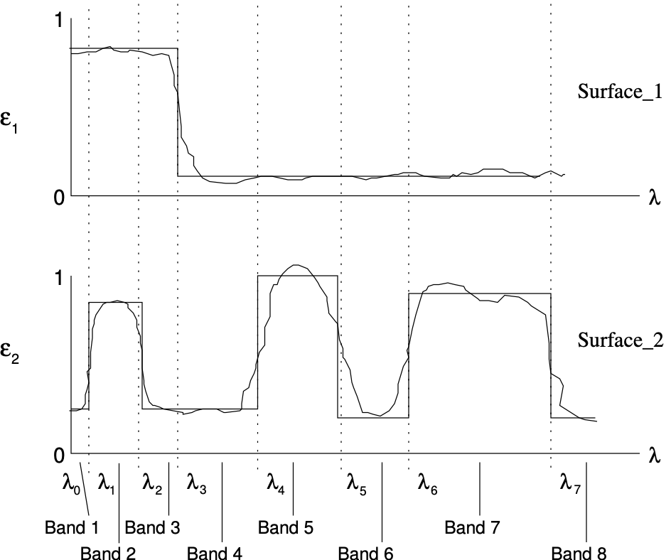 The enclosure radiation model previously presented considers a net response over all wavelengths assuming that all surfaces behave as grey bodies. Here the surface response with regard to different wavelengths is implicitly included in the model by using temperature dependent emissivities and allowing the surfaces to emit as grey bodies. In this case the surface flux previously mentioned (3.107) can be alternatively expressed as