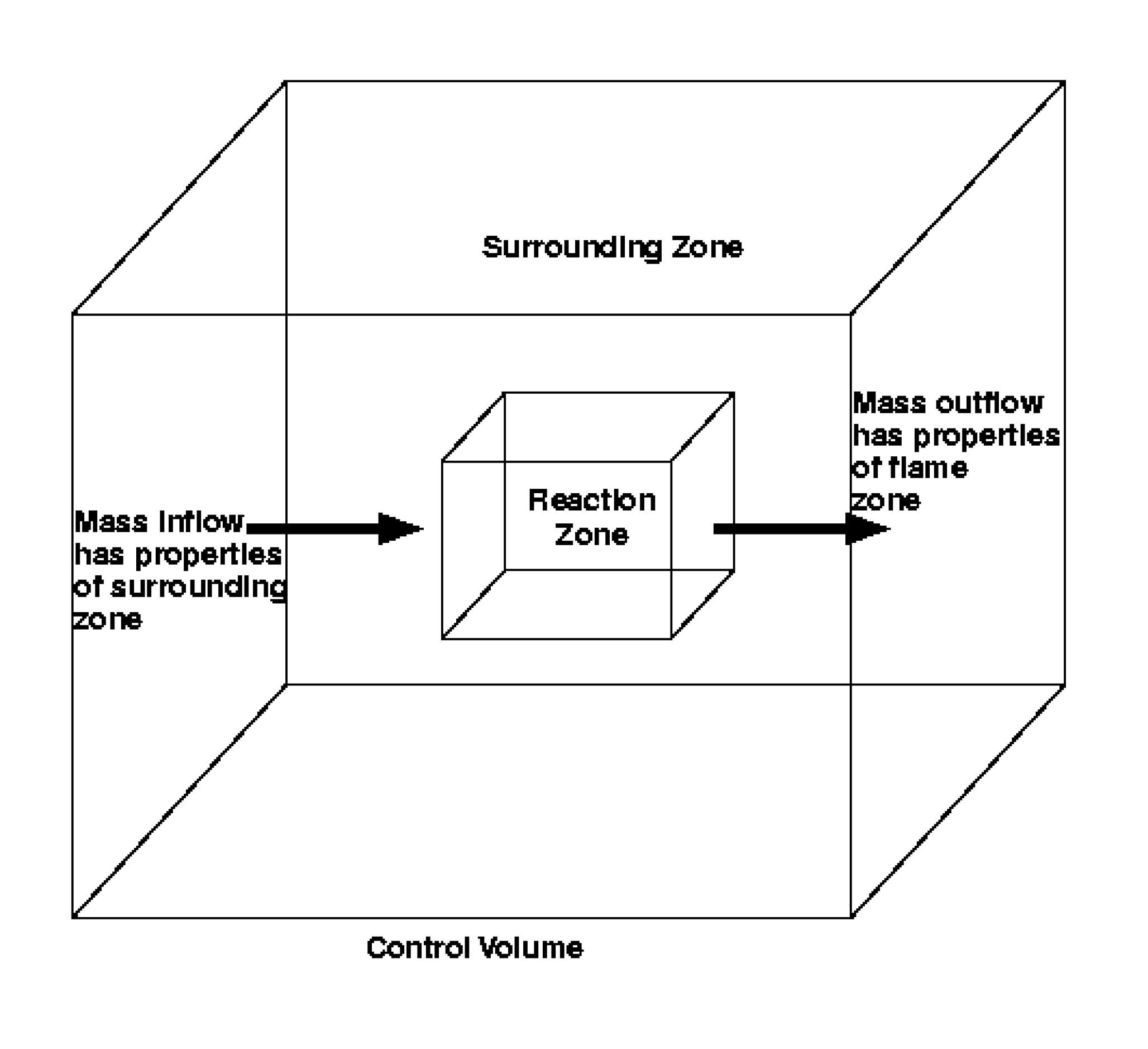 The model function is to provide an integral effect of combustion processes occurring within the control volume for the duration of a time-step. In this manner, reaction zone structures are not resolved, but the aggregate effect of turbulent combustion is modeled. To model the integral effect, two homogeneous zones are defined within each control volume for which there is combustion, as shown in Figure 3.3. The zones are termed the reaction zone (fine structures) and the surrounding zone. The size and mass exchange rate between these zones are influenced by the local turbulence properties and are the principal means by which turbulent fluctuations are accounted for within the model. The assumption that each zone is homogeneous is equivalent to assuming that the mixing within each zone is instantaneous. Since combustion occurs within (but is not limited to) the reaction zone, the assumptions for combustion correspond to those for a perfectly stirred reactor (PSR). Slower reactions can also occur in the surroundings, in which case, the assumptions for reaction in the surroundings are also consistent with PSR assumptions.