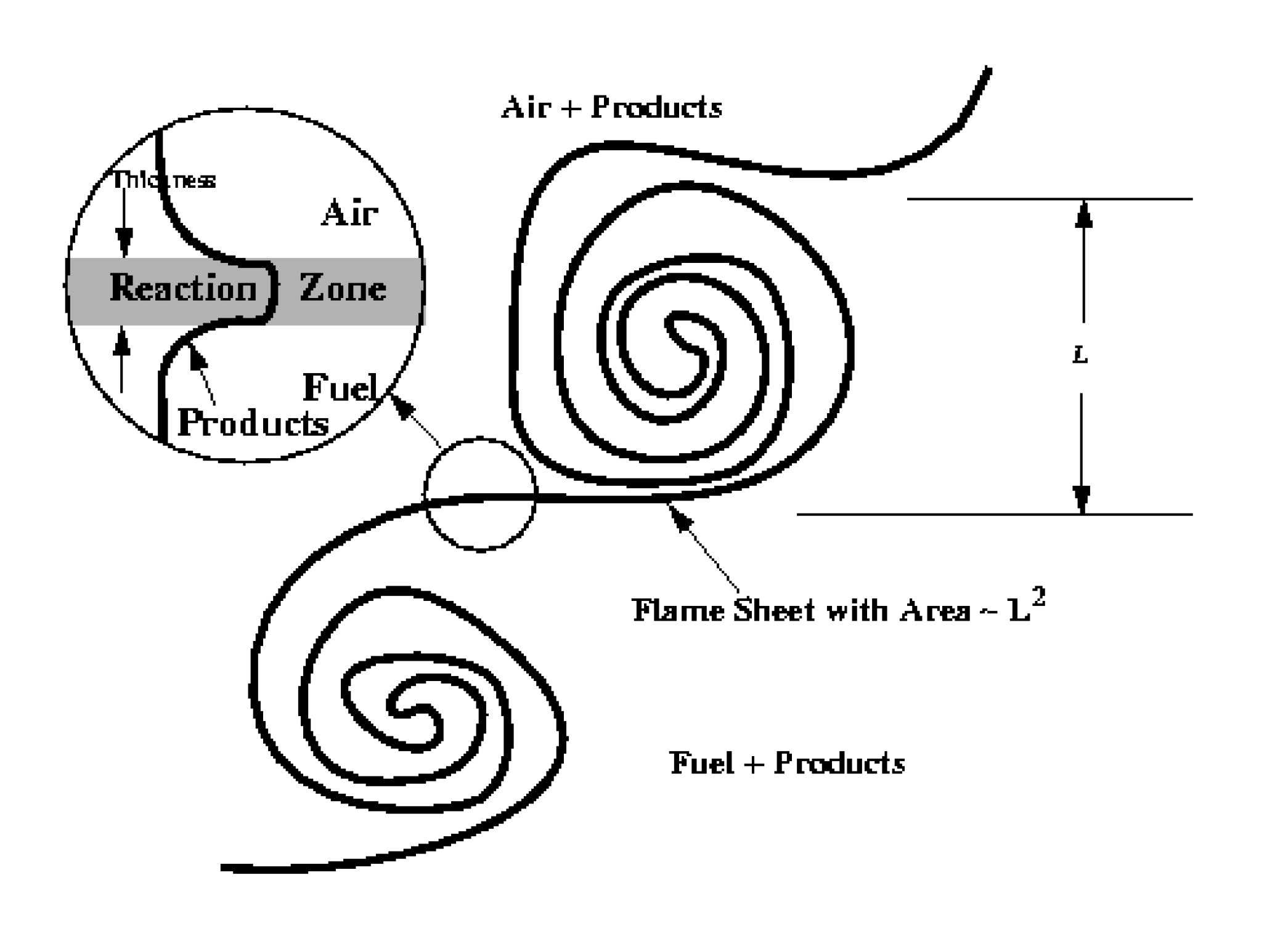Magnussen’s EDC model attempts to represent the mixing processes that are most important to the overall heat release from combustion. It it based on the assumption that the overall heat release rate is controlled by the mass transport into the reaction zone. Therefore, considerable effort is made to model turbulent momentum processes that affect mass transport into the reaction zone. In the surrounding gases, turbulent mixing occurs with (in all likelihood) a similar vigor, however, its effect on the combustion rate is considered less important since the turbulence is not directly contributing to mass transport into the reaction zone. For this reason, there are two different levels of mixing assumptions made within the model.