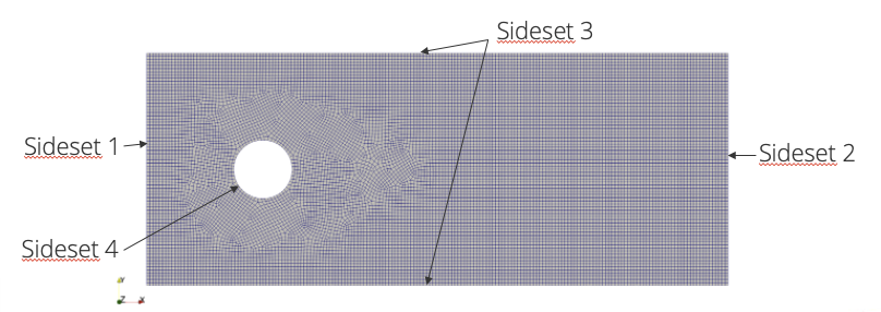 In this mesh we have included the four sidesets that were defined. Sideset 1, 2 and 3 represent the free flow boundaries and sideset 4 represents the solid wall cylinder boundary.