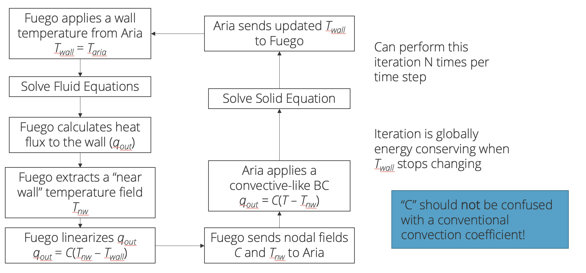 In this particular coupling procedure, Aria will send a wall temperature to Fuego, and Fuego, after doing a fluid solve, will send back a heat flux back to Aria. This is a conditionally stable procedure and in general will be 2nd order accurate.