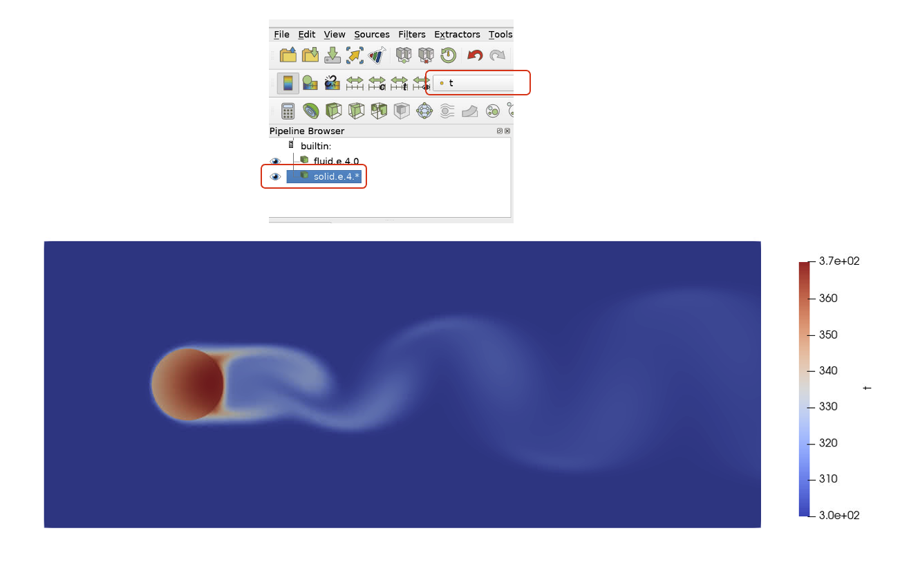 Now we have a full picture of the temperature field on both the solid and fluid domains. Notice that the temperature inside the cylinder is lower at the leading edge compared to the trailing edge. This is an effect of the convective cooling of the relatively cold fluid temperature on the relatively hot solid temperature. Notice how the temperature of the trailing vortices changes as it travels downstream.