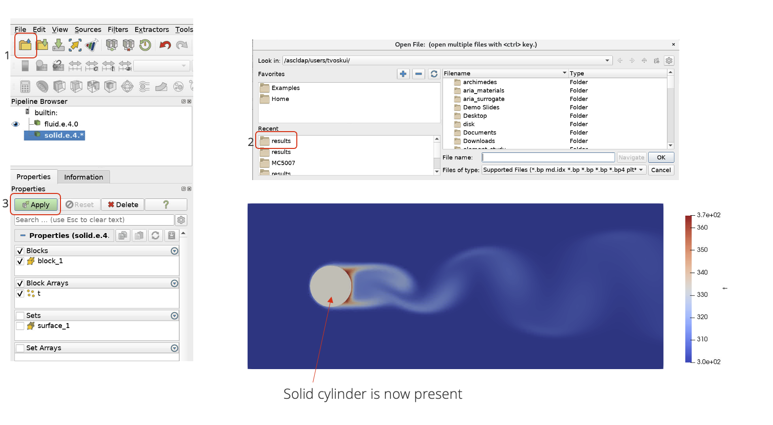 Notice that since we have only loaded the Fuego results exodus file, we only see the Fuego region of the flow field. Let’s load the solid (Aria) region in the same view.