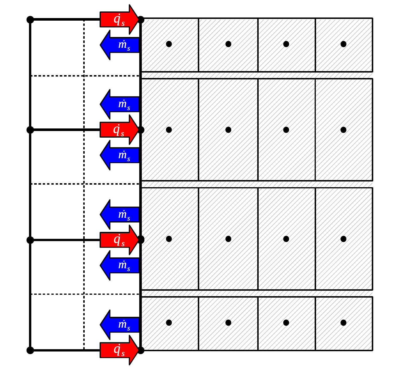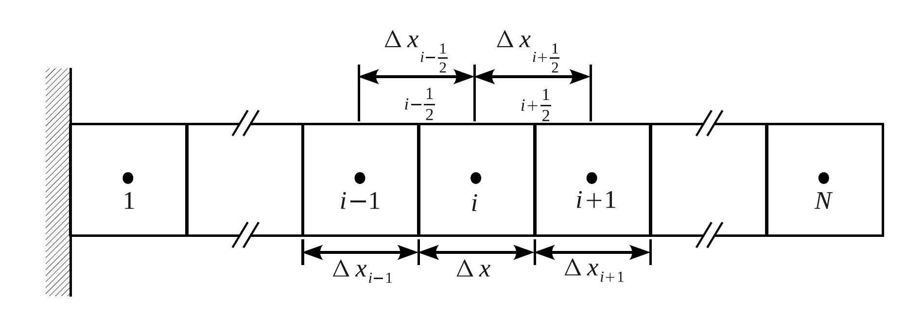 For this boundary condition, a series of independent one-dimensional virtual domains exist behind each CVFEM surface node, and each virtual 1D domain has a cross-sectional area that matches the group of CVFEM boundary sub-control surfaces that contain the single “parent” surface node. A classical cell-centered finite volume methodology is used for the 1D virtual domains, where the discretization, storage, and numerical solutions all occur within the boundary condition implementation and only interact with the main CVFEM flow solution through fluxes and solution variables at the exposed surface.
