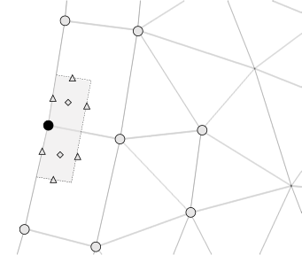 Fig. 3.2 Control volume definition for an exposed surface. The degree of freedom is noted by the dark circle; shading of the control volume is also indicated. Triangles and diamonds depict surface- and volume-based integration point locations.