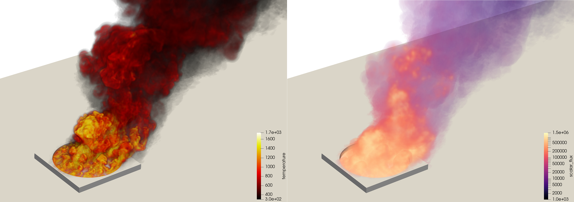 Fig. 1.1 Example Fuego/PMR fire simulation with temperature (left) and scalar flux (right)