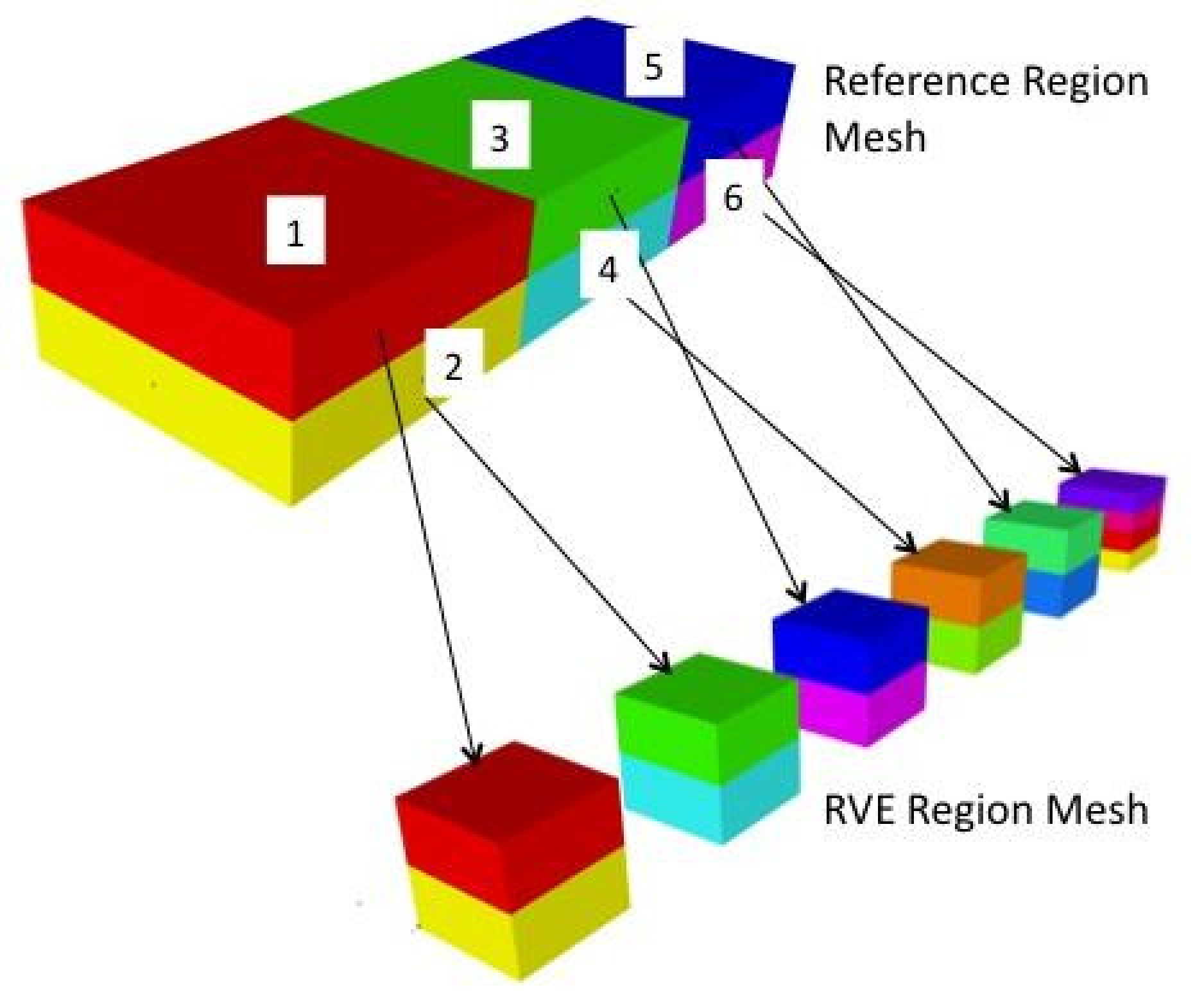 Two mesh files, one for the reference region and one for the RVE region, are required for an RVE analysis. Fig. 2.1 shows an example of the two meshes. The reference mesh of a bar with six single integration point elements is shown on the upper left. On the lower right is the mesh for the RVE region containing six RVEs, one for each element (since the elements have only one integration point) of the reference region. In this case, the first five RVEs each consist of two element blocks and the last RVE has four.