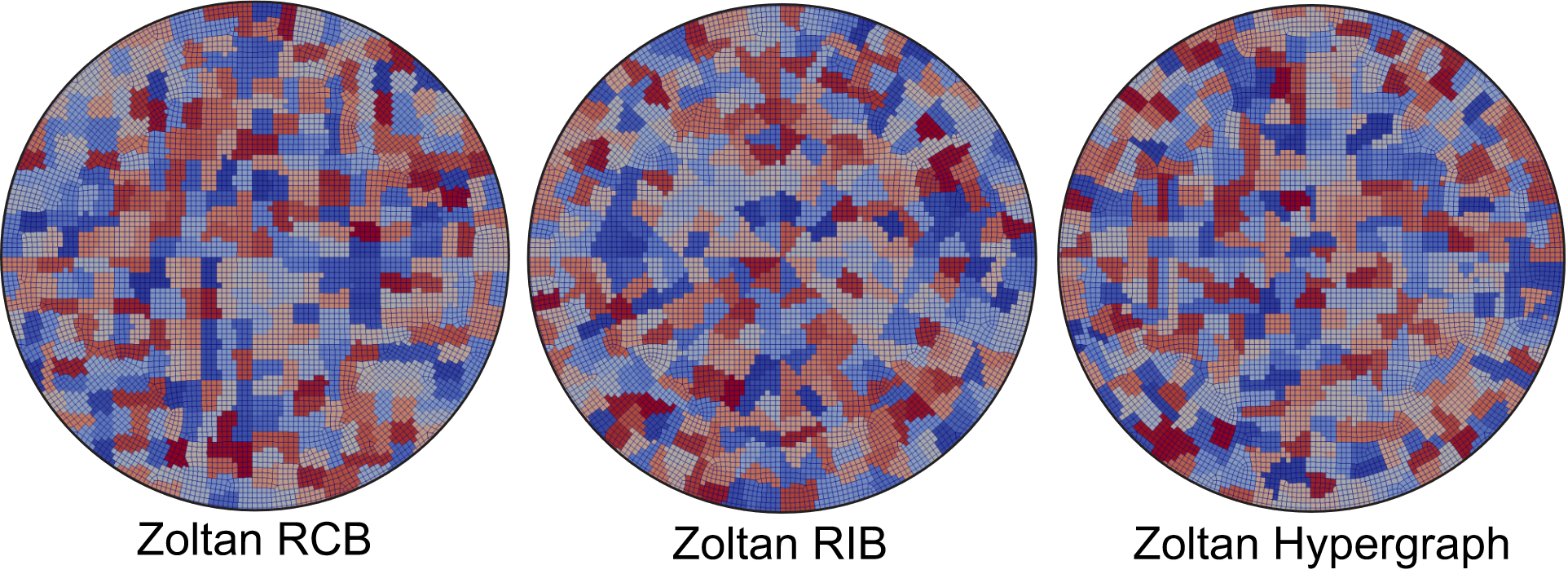 Fig. 12.1 Illustration of 400 nonlocal partitions at a sharp crack tip using Zoltan Recursive Coordinate Bisection (RCB), Zoltan Recursive Inertial Bisection (RIB), and Zoltan Hypergraph partitioning methodologies. Note that Zoltan Hypergraph can generate non-contiguous domains. The default partitioning methodology in Sierra is Zoltan RCB.