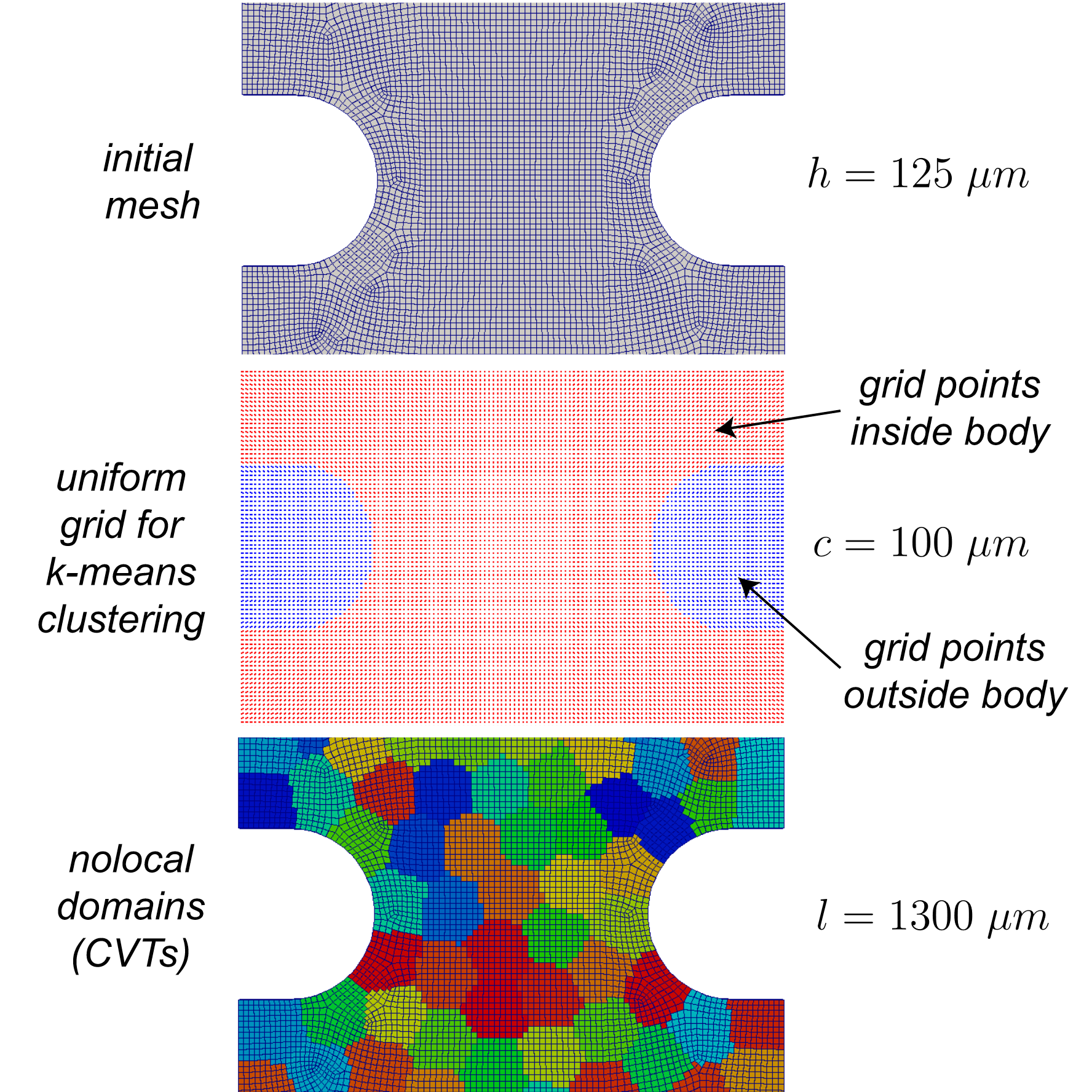 Initial findings employing geometric partitioning illustrated a sensitivity to domain shape. A re-examination of Fig. 12.1 will reveal that the aspect ratios of the domains are significant. Because we are aligning the evolution of a nonlocal variable with the nonlocal domain shape, domains of increasing aspect ratio result in anisotropic evolution. Although other researchers have developed methods for domain decomposition that focus on domain shape [[1]], we gravitated towards clustering algorithms and the resulting isotropy [[2]]. Fig. 12.2 illustrates the mesh, grid, and result of k-means clustering, a centroid Voronoi Tessellation (CVT). Given a body on processor with mesh size \(h\), we overlay a grid with uniform cell size \(c\). We then find points both inside (red) and outside (blue) the body. After calculating the number of nonlocal volumes \(N\) for a body of volume \(B\) through \(N = B/l^{3}\), we seed the centroids of the nonlocal domains through Zoltan RCB. K-means clustering of points inside the body evolves the locations of the centroids via Lloyd’s algorithm. The algorithm will converge to a CVT, independent of the FE discretization. The tolerance for convergence \(tol\) is specified as a fraction of the cell size \(c\). The nonlocal domains are then populated by each element’s proximity to the nearest CVT centroid. The resulting nonlocal domains are illustrated in Fig. 12.2. We note that the nonlocal domain size is only illustrative. Nonlocality in damage, for example, would require a smaller length scale \(l\) resulting in a finer discretization of Voronoi polygons.