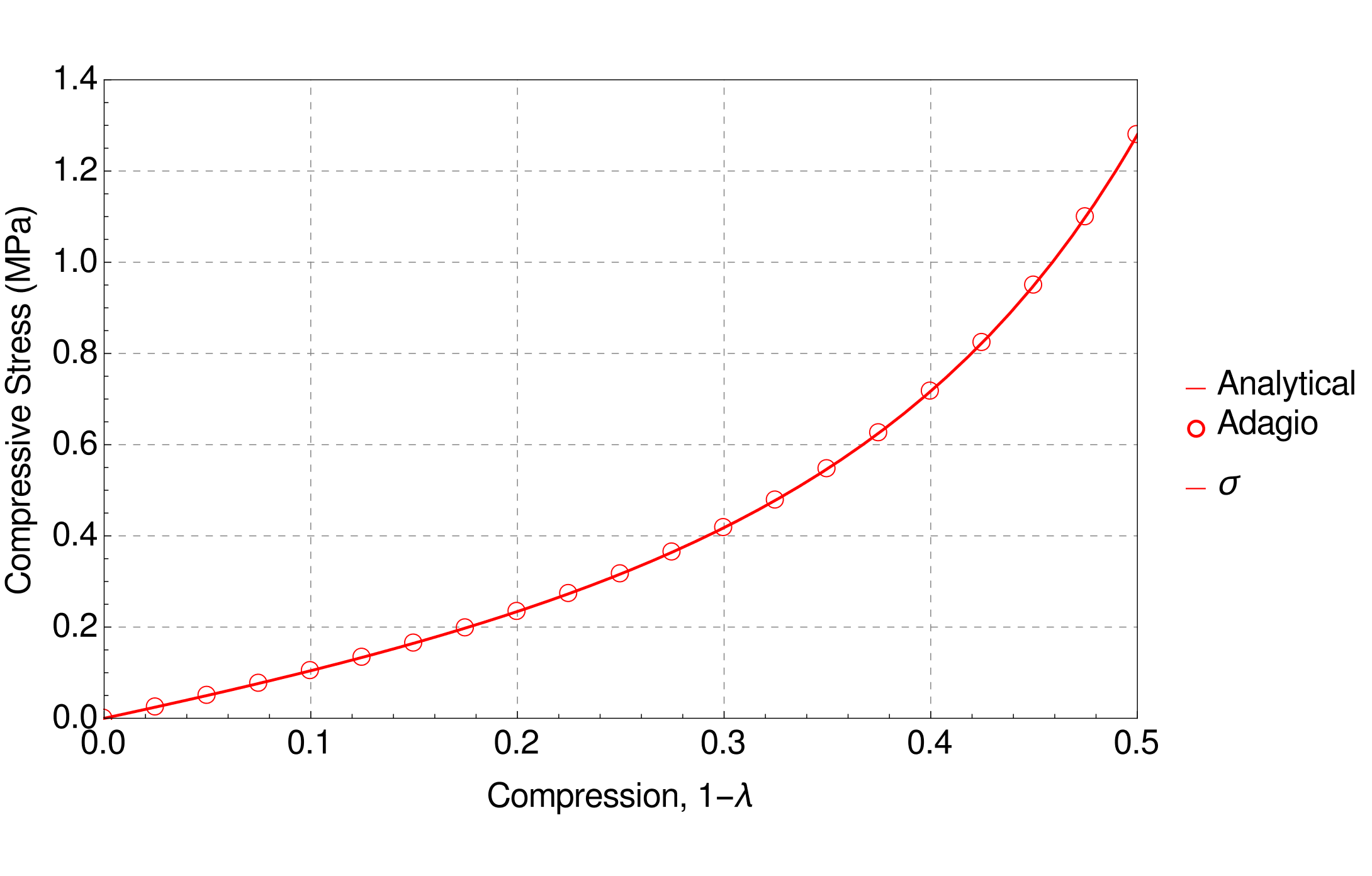 Fig. 4.15 Stress determined analytically and numerically for the Gent model during displacement controlled hydrostatic compression.