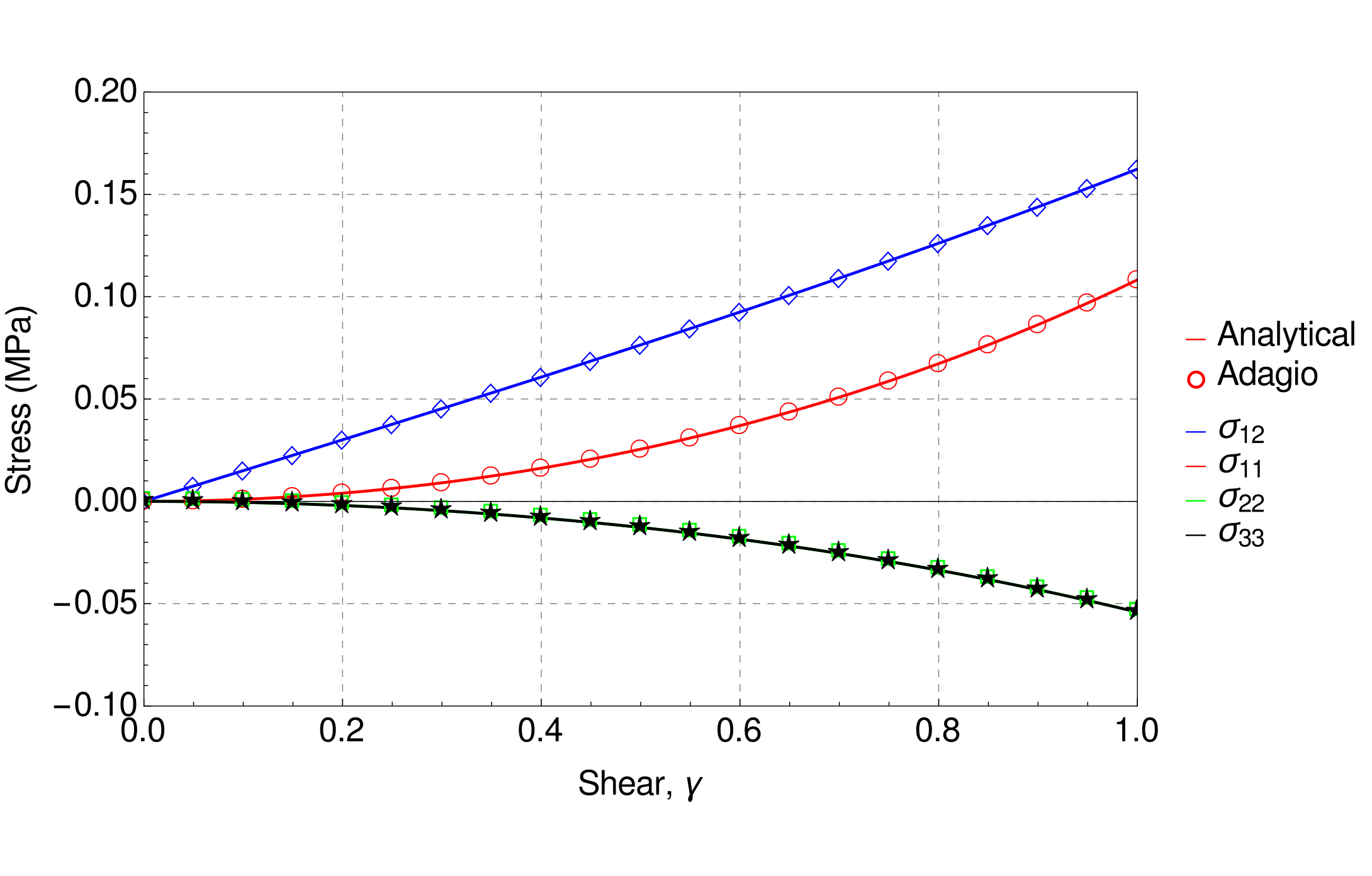 It is possible to find closed form solutions for a number of loadings. Three problems are described here: uniaxial strain, simple shear, and hydrostatic compression. One set of material properties was used for all tests and they are given in Table 4.4. The elastic modulus and Poisson’s ratio are given in addition to the bulk modulus, shear modulus, and limiting chain extensibility parameter, \({J}_{m}\).