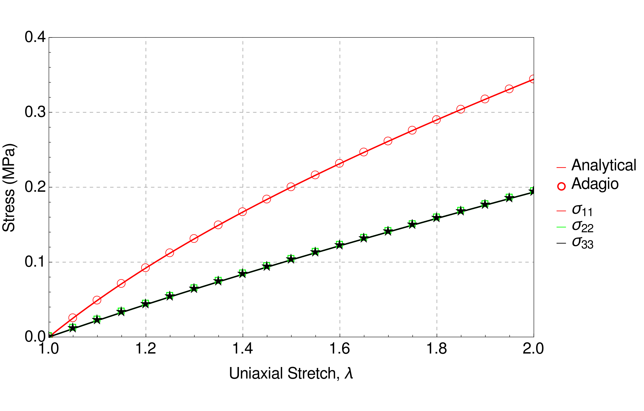 Fig. 4.13 Analytical and numerical results for the uniaxial stretch case.