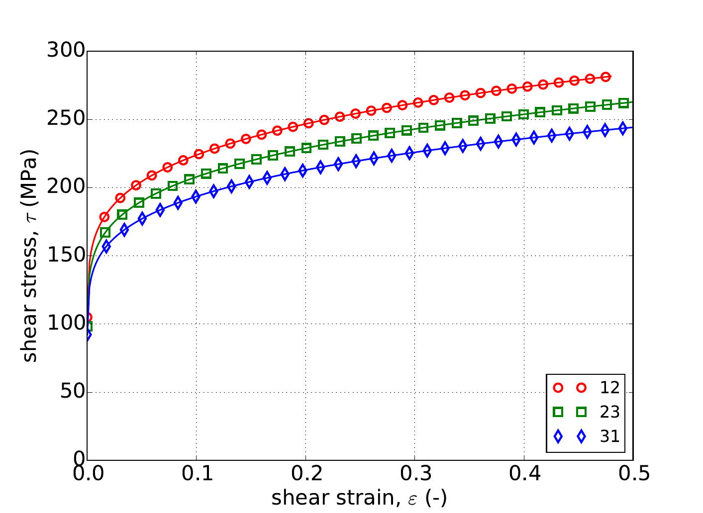 with \(\phi\) being the effective stress and \(\bar{\sigma}\) is the current yield stress that may be dependent on rate and/or temperature. The Hill effective stress is essentially an orthotropic extension of the von Mises function. After accounting for plastic incompressibility and related constraints, there are six individual yield stresses: \(\sigma^{y}_{11}\), \(\sigma^{y}_{22}\), \(\sigma^{y}_{33}\), \(\tau^{y}_{12}\), \(\tau^{y}_{23}\), and \(\tau^{y}_{31}\). These yield stresses correspond to 3 normal and 3 shear yield stresses. Written in terms of the components, the effective stress has the form,