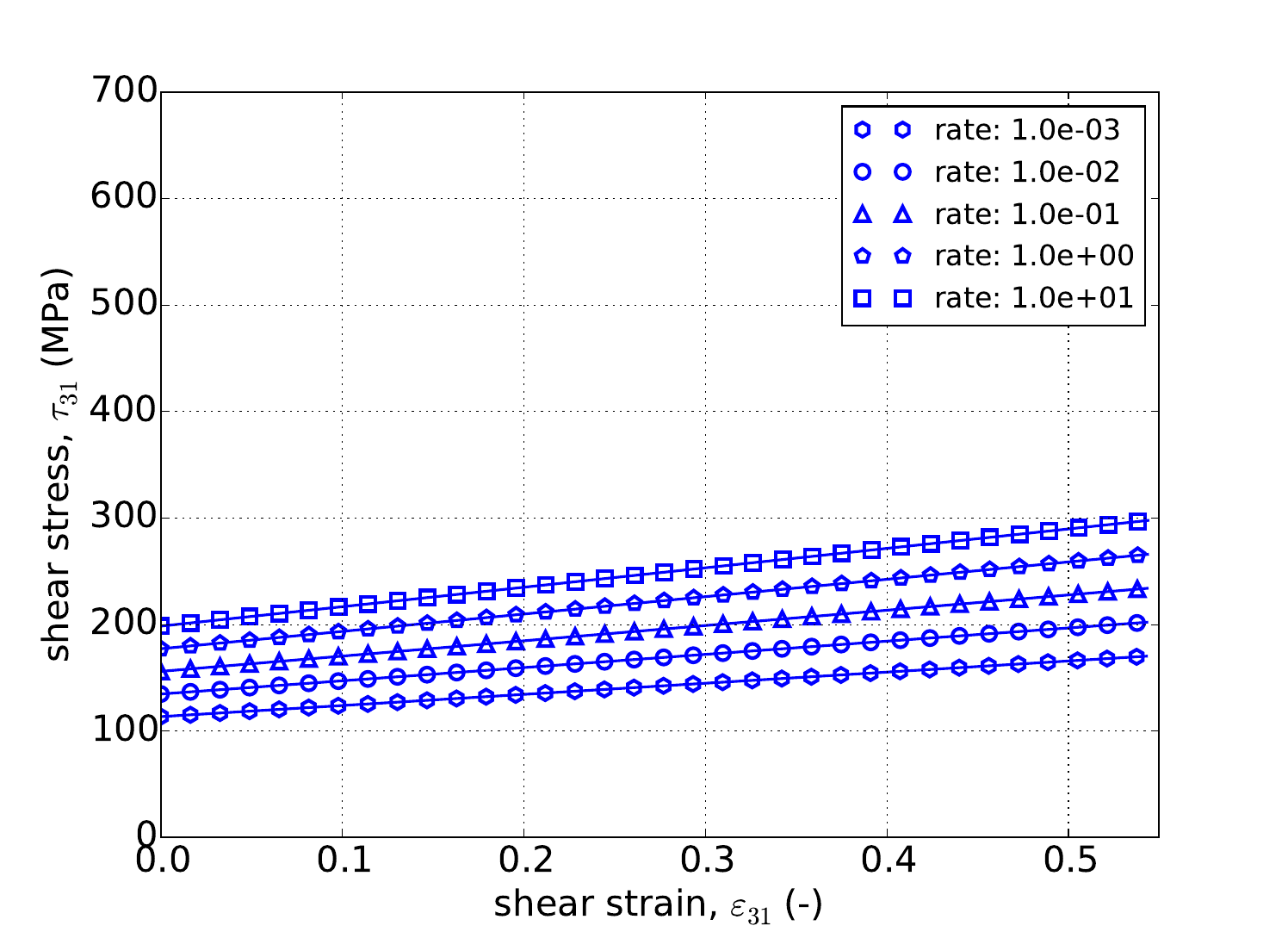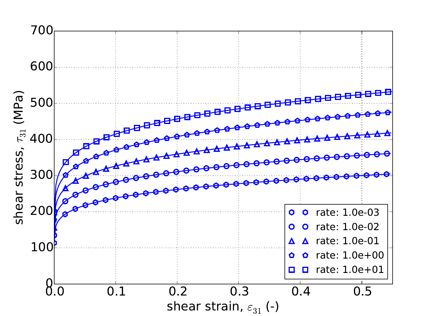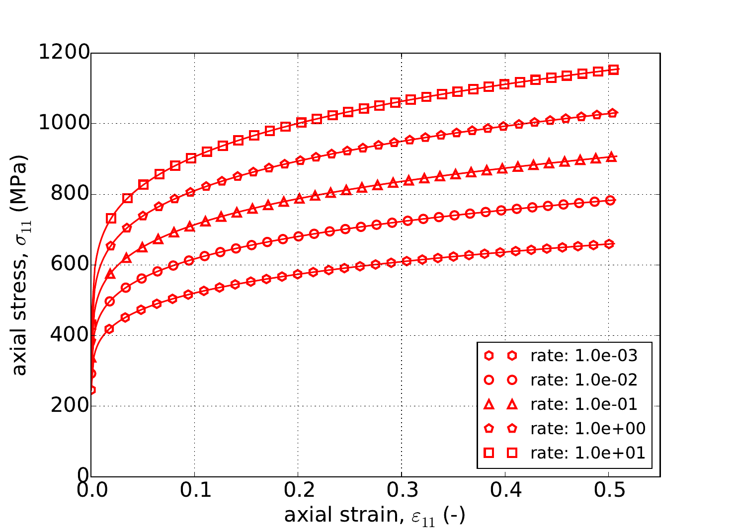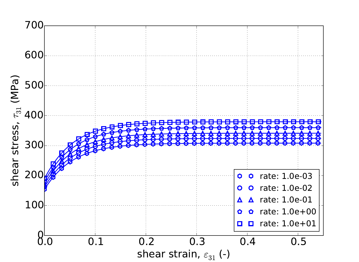 with \(\tilde{\sigma}_y\left(\bar{\varepsilon}^p\right)\) being the user supplied rate independent expression, \(g\) is a model parameter related to the activation energy required to transition from climb to glide-controlled deformation, and \(m\) dictates the strength of the dependence.