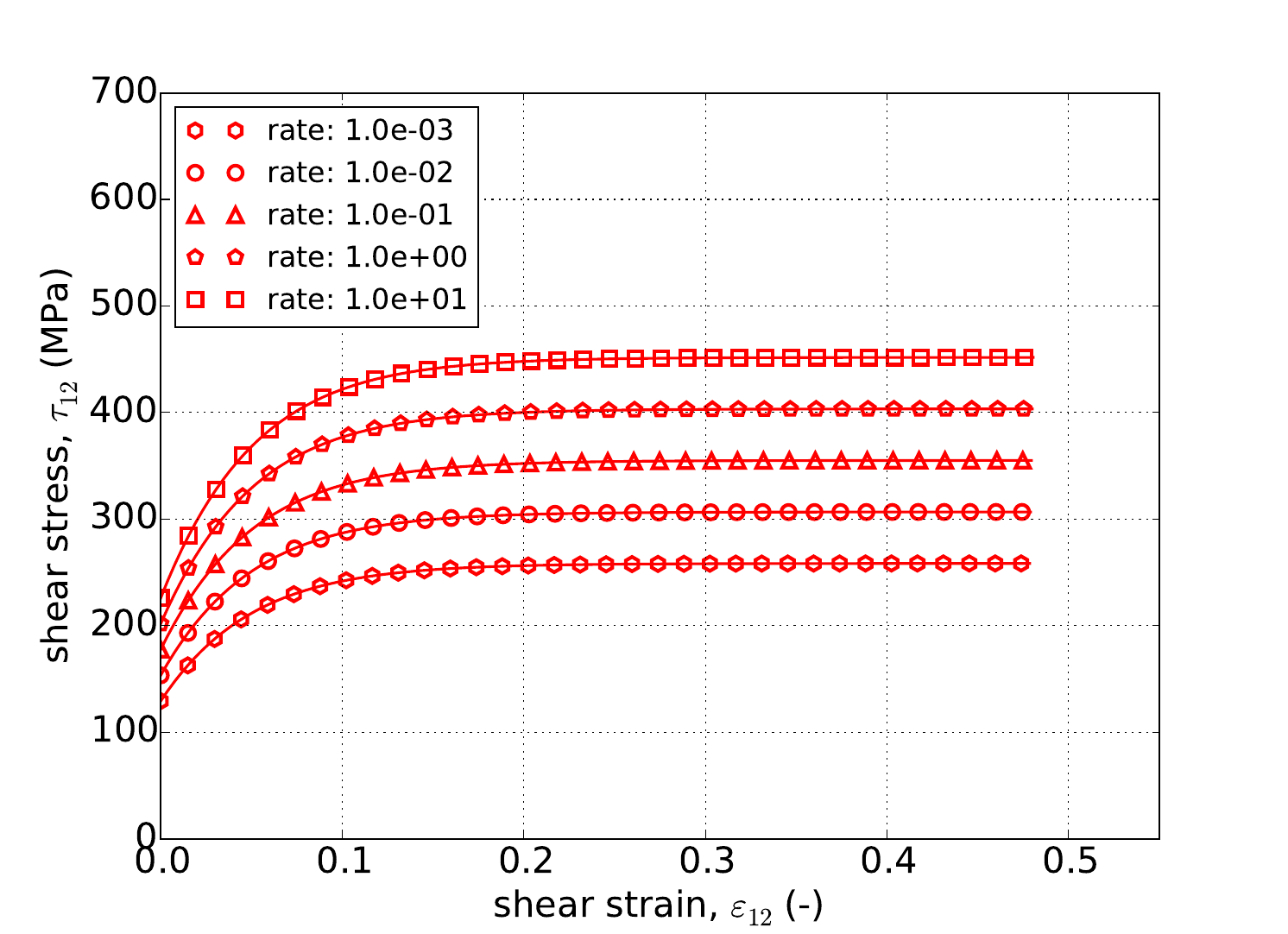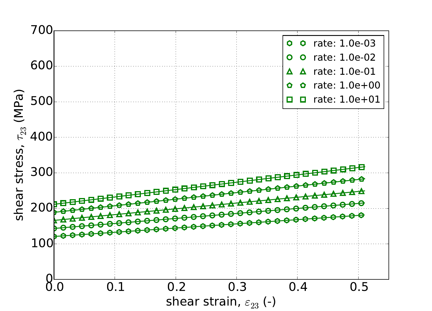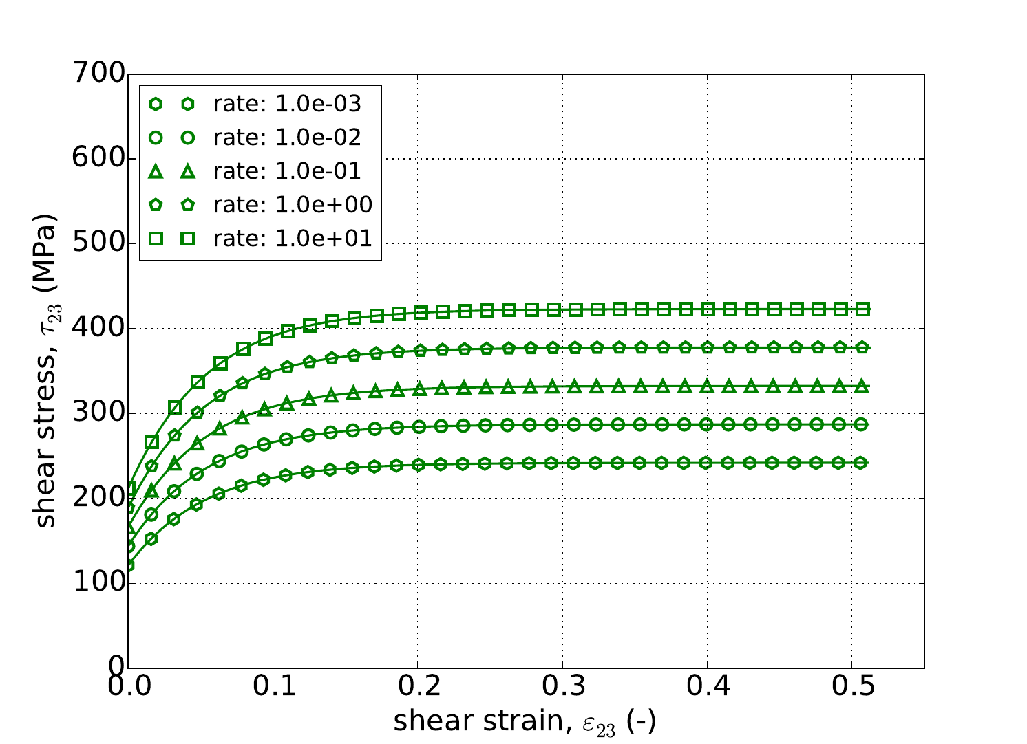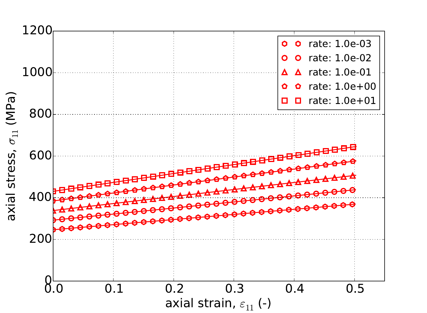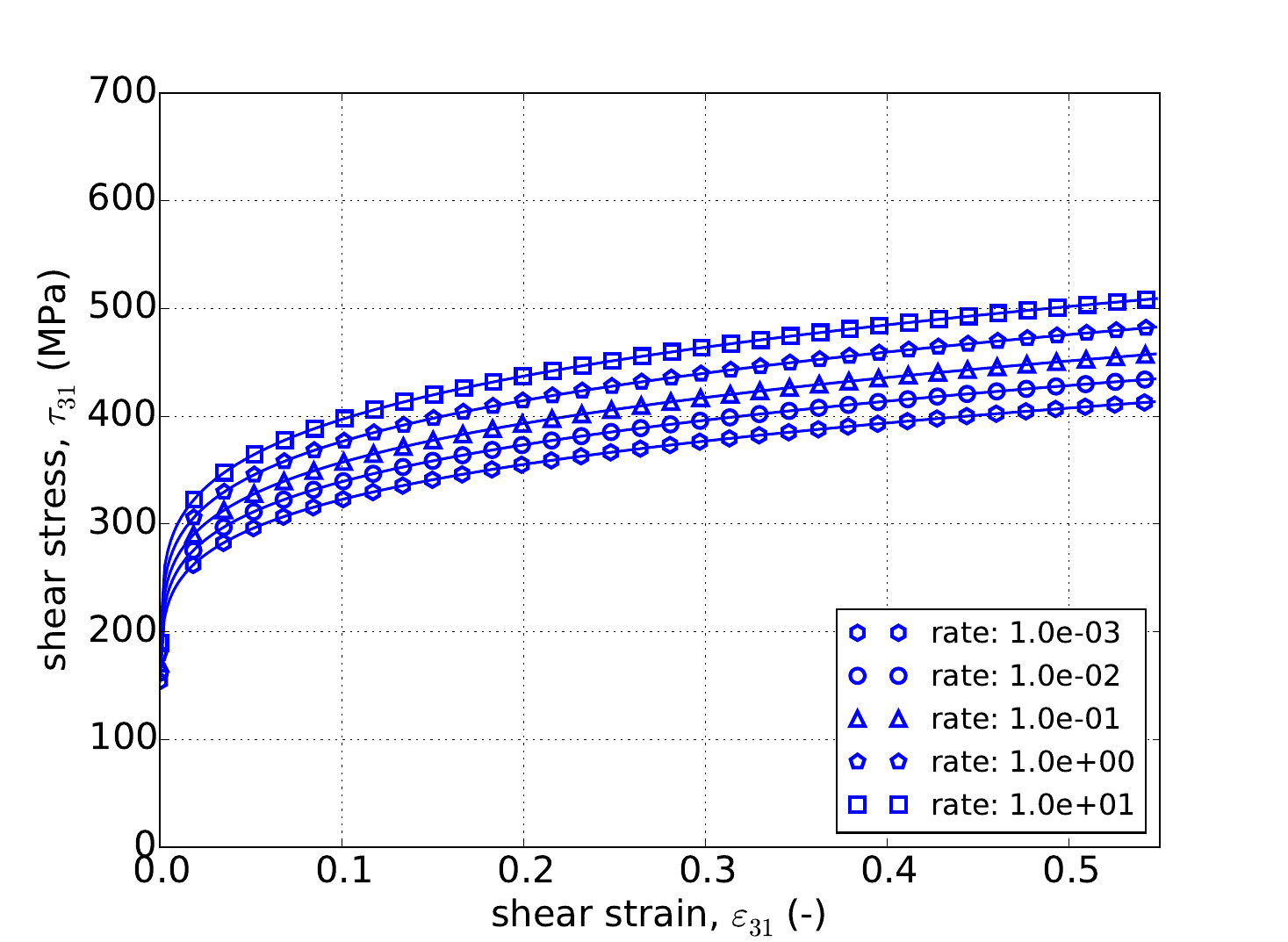 with \(\tilde{\sigma}_y\left(\bar{\varepsilon}^p\right)\) being the user supplied rate independent expression, \(g\) is a model parameter related to the activation energy required to transition from climb to glide-controlled deformation, and \(m\) dictates the strength of the dependence.