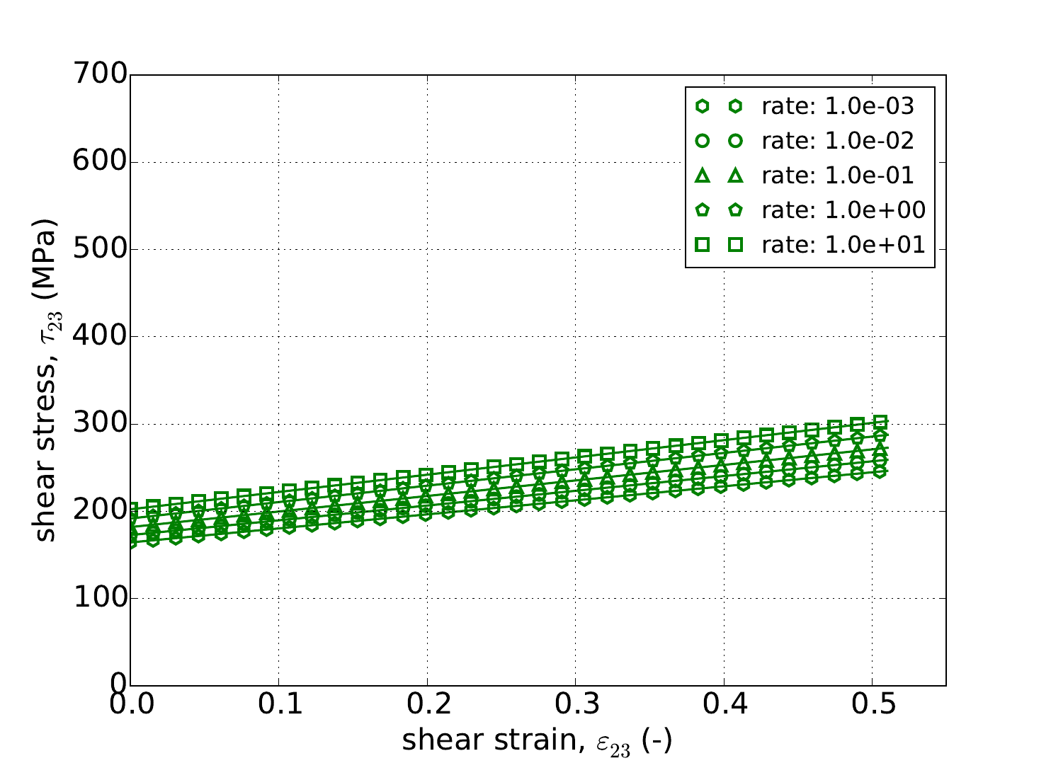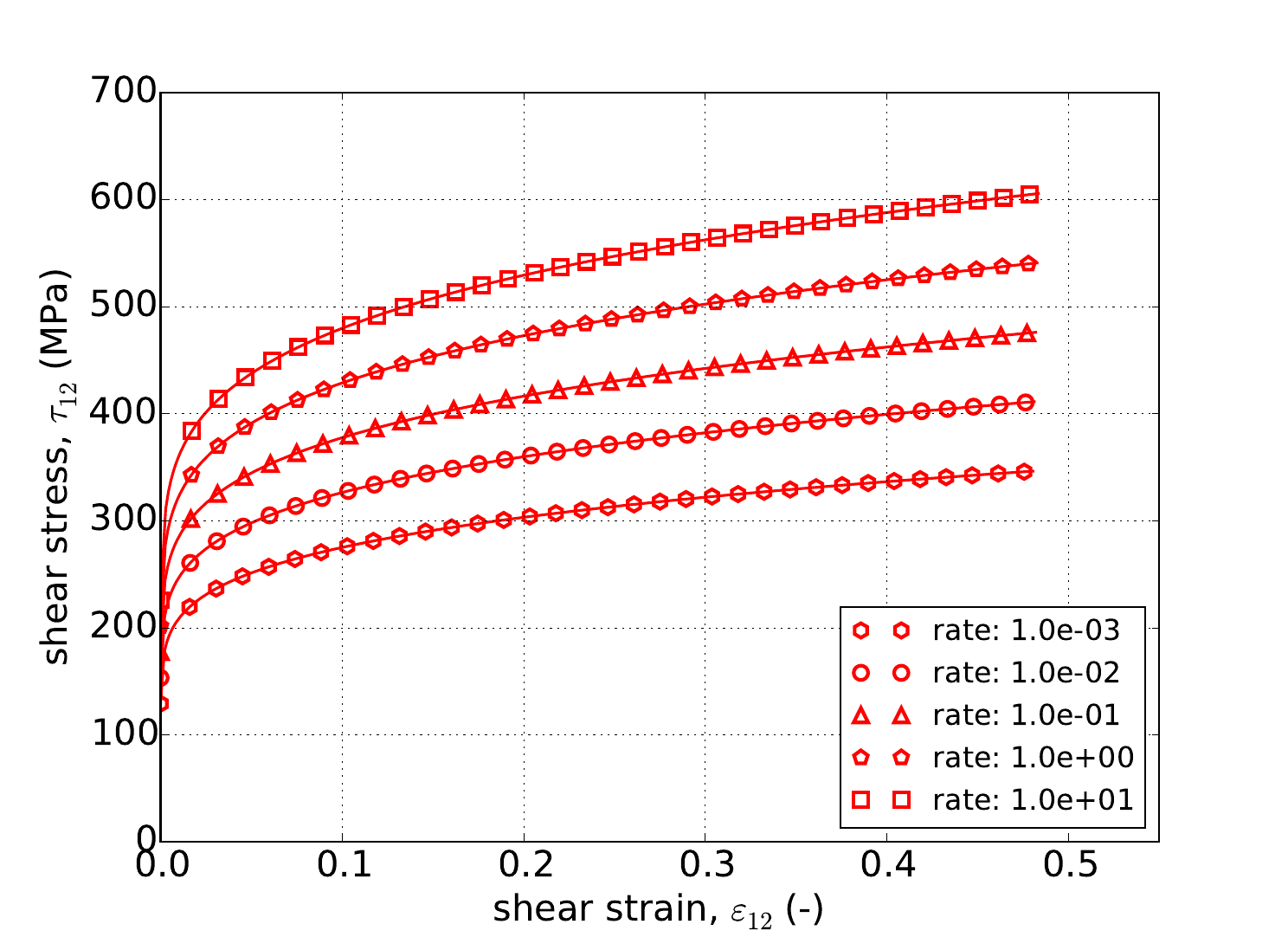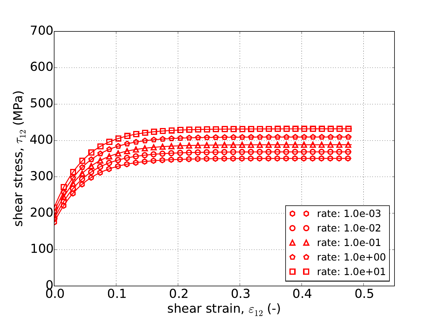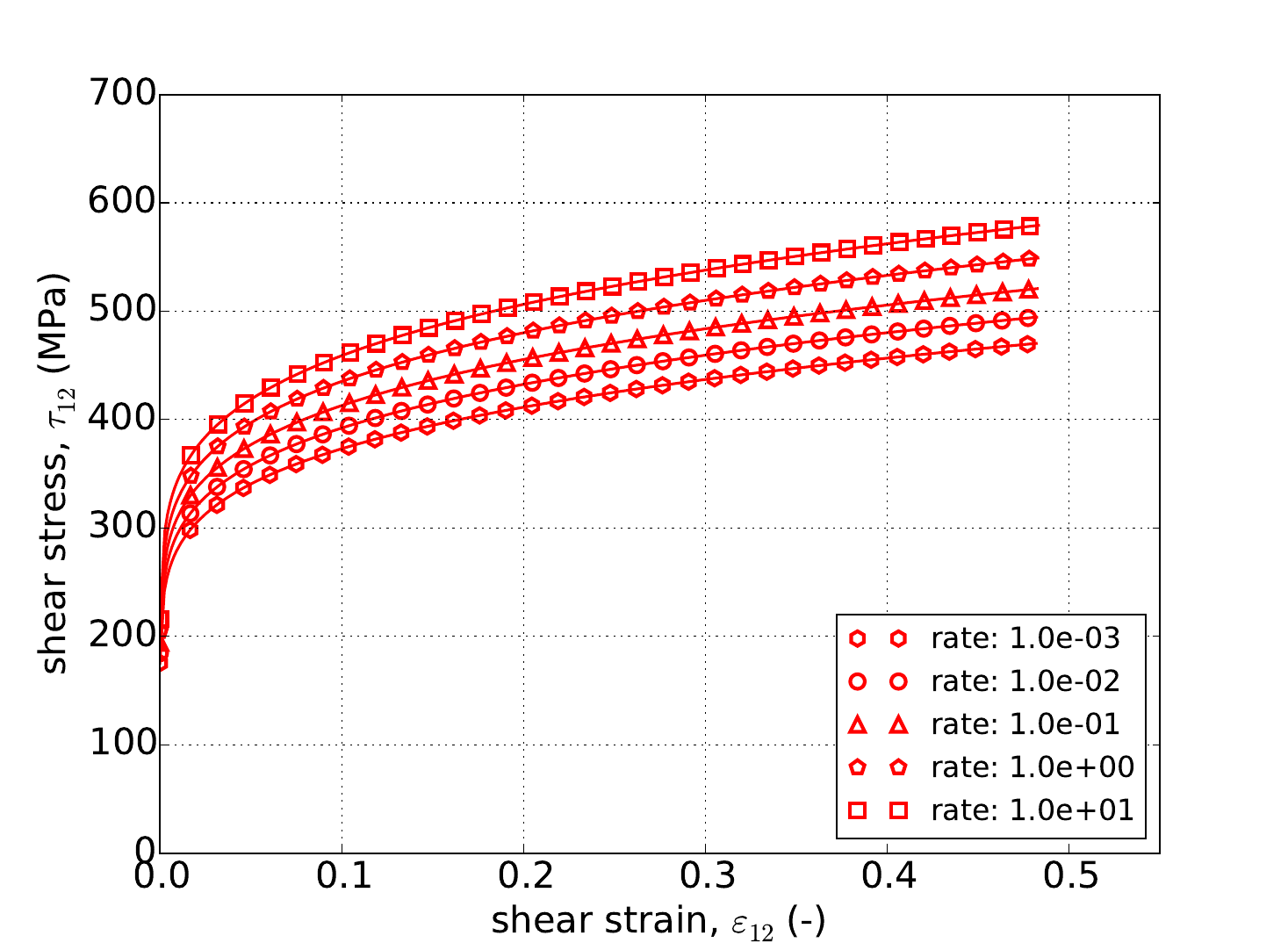 with \(\tilde{\sigma}_y\left(\bar{\varepsilon}^p\right)\) being the user supplied rate independent expression, \(g\) is a model parameter related to the activation energy required to transition from climb to glide-controlled deformation, and \(m\) dictates the strength of the dependence.