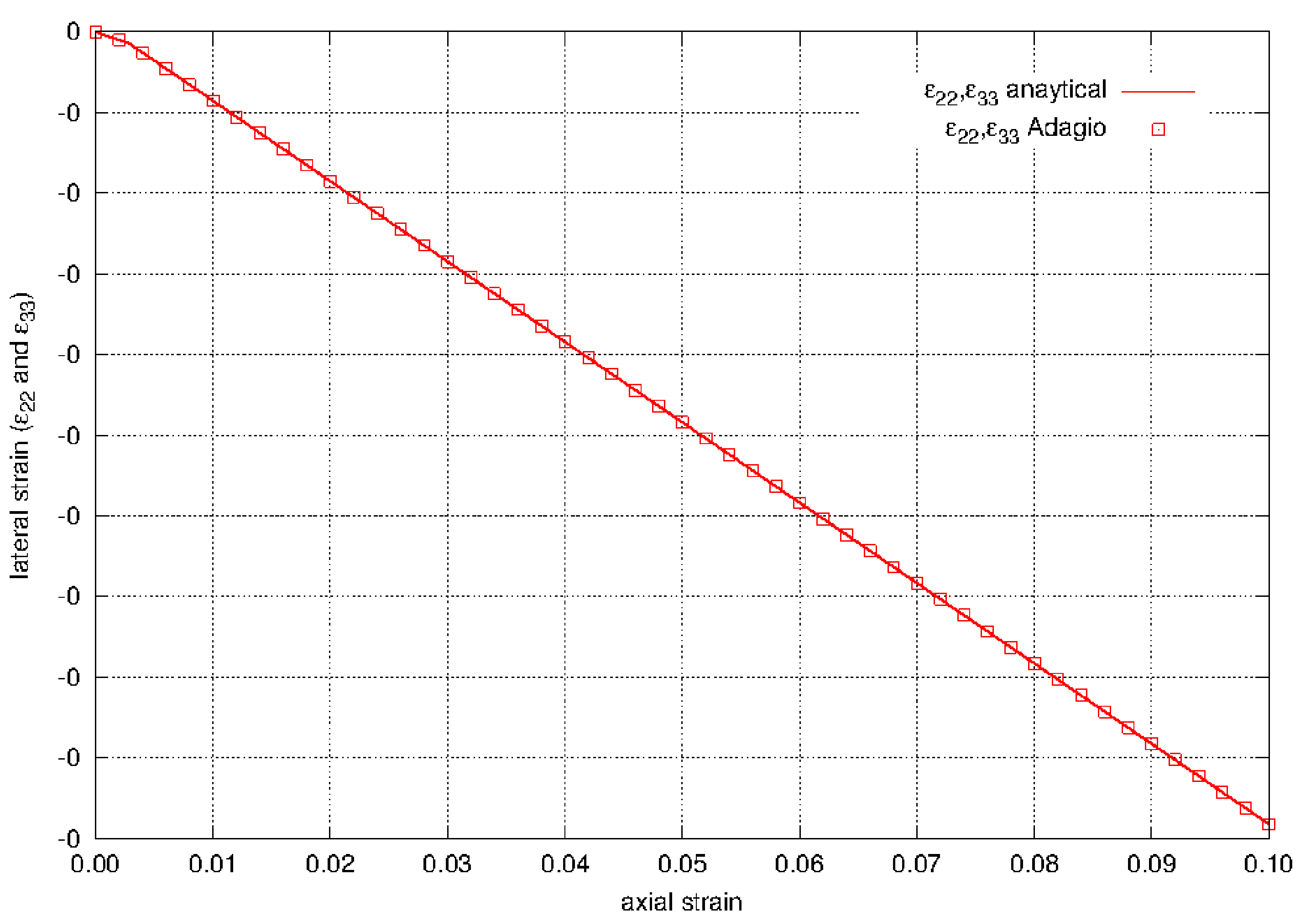 The uniaxial stress calculated by the model in Adagio is compared to an analytical solution. For uniaxial loading in the \(x_{1}\) direction, the effective stress is