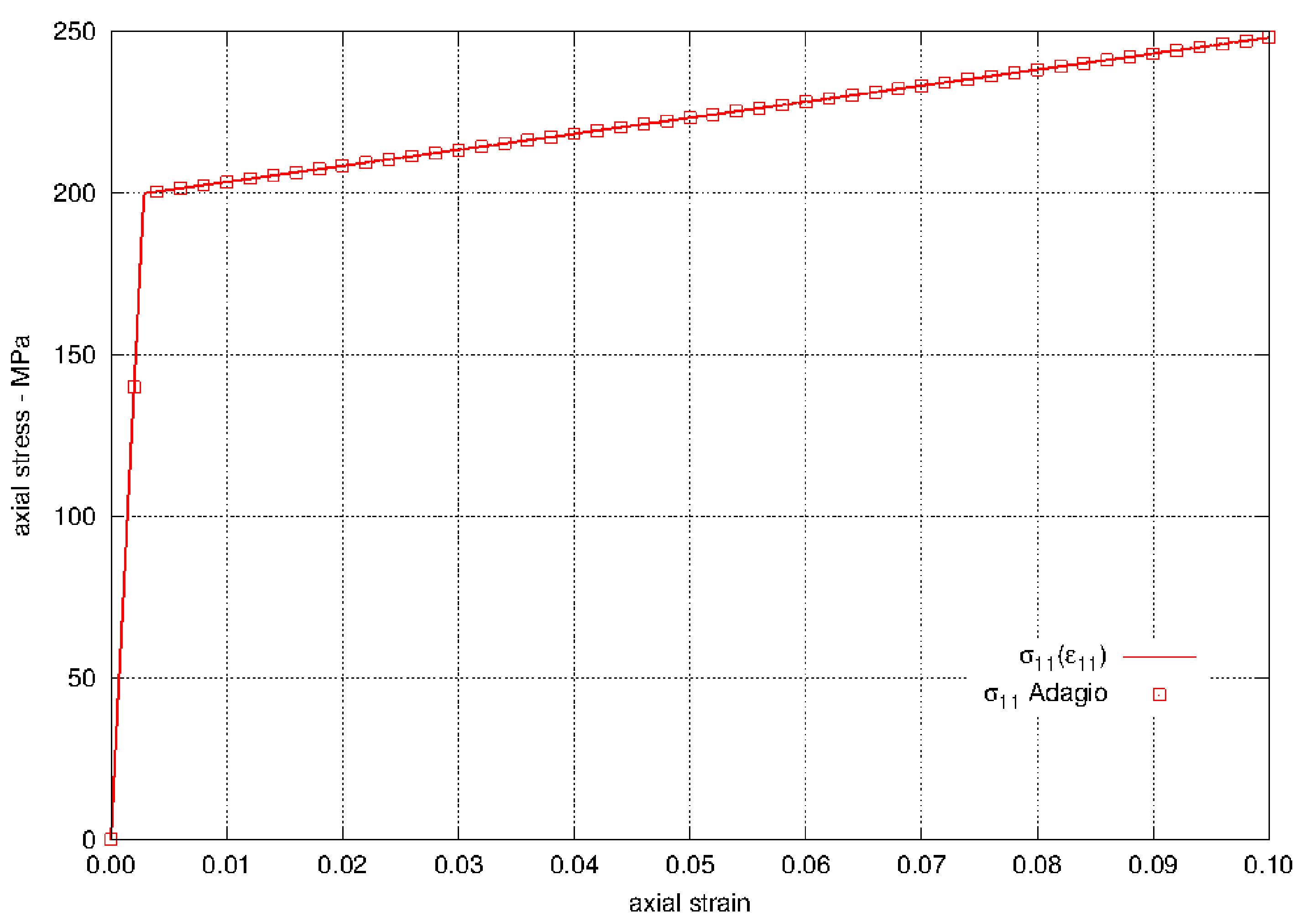 The results for the elastic-plastic model loaded in pure shear are shown in Fig. 4.19. We see that the stress strain curves in pure shear as calculated by Adagio follow the expected stress strain curves. All other stress and strain components for the three problems are zero.