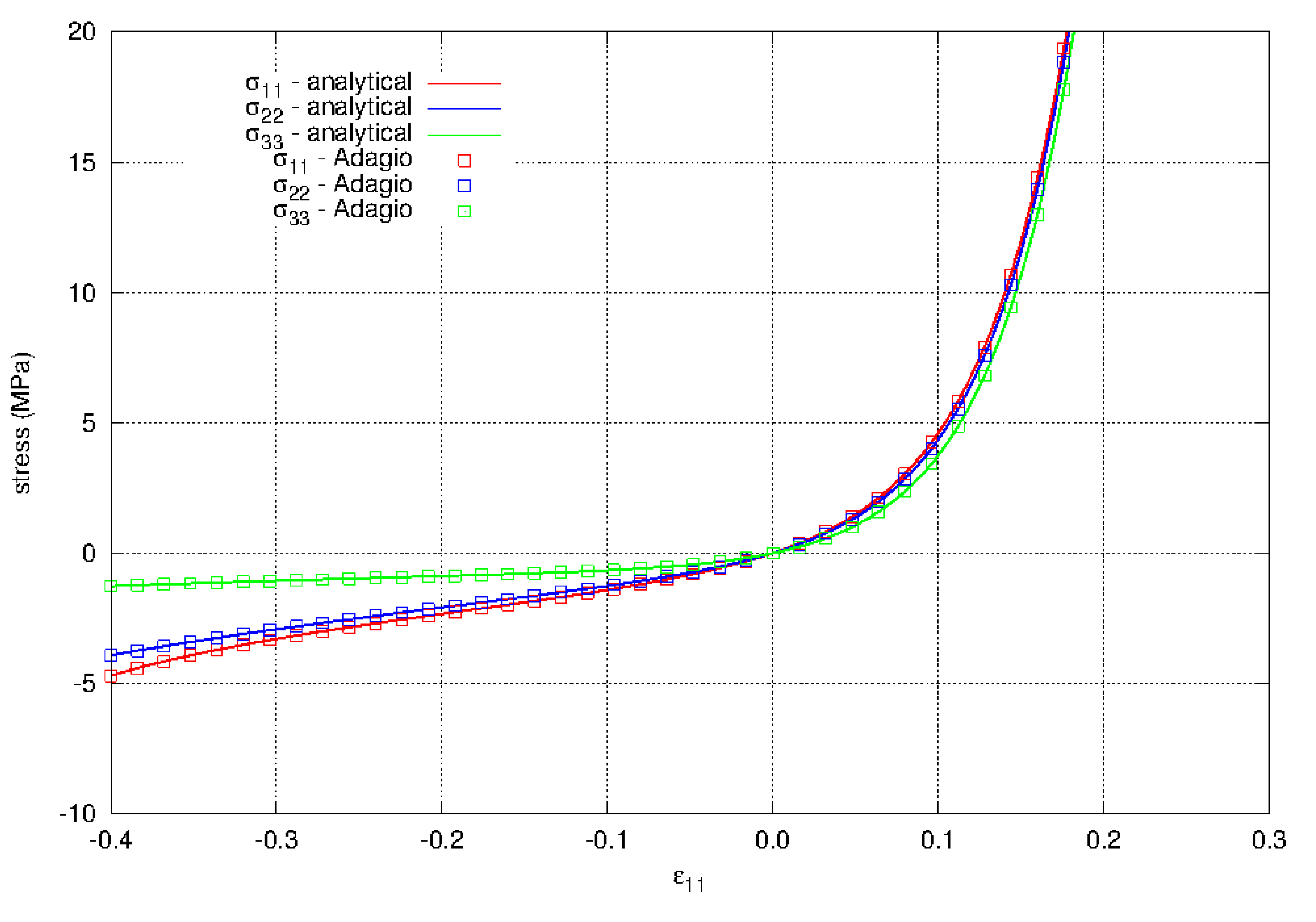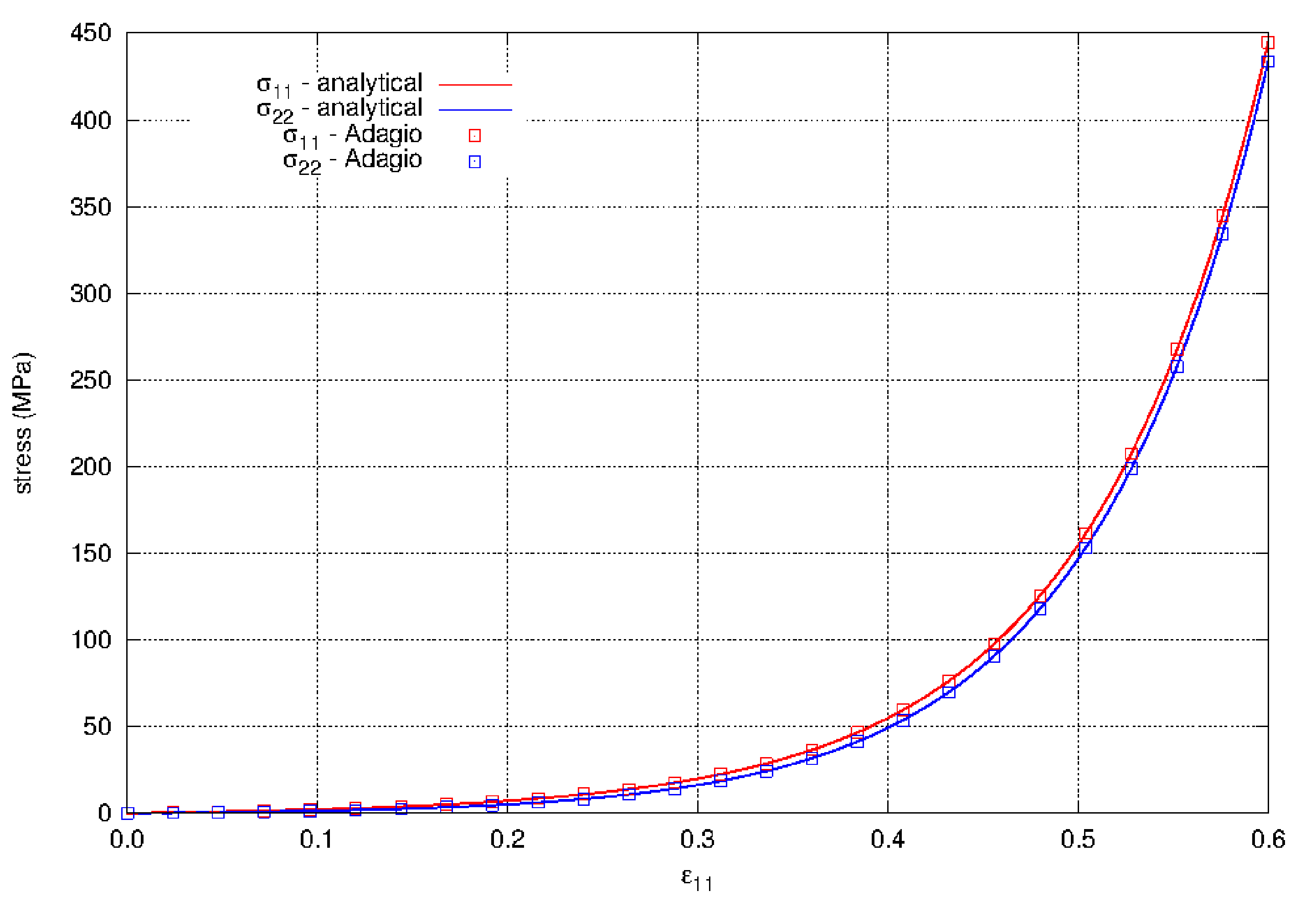 For the results in Fig. 4.108, a single element is strained with \(\varepsilon_{1} = 0.4\) and \(\varepsilon_{2} = 0.2\) which, in biaxial strain in tension, is very large for this model. At some point the normal stresses begin to increase rapidly. Since the normal stresses are very large, the hydrostatic pressure is also very large. For this extreme loading the model in Adagio shows agreement with the analytical solution.