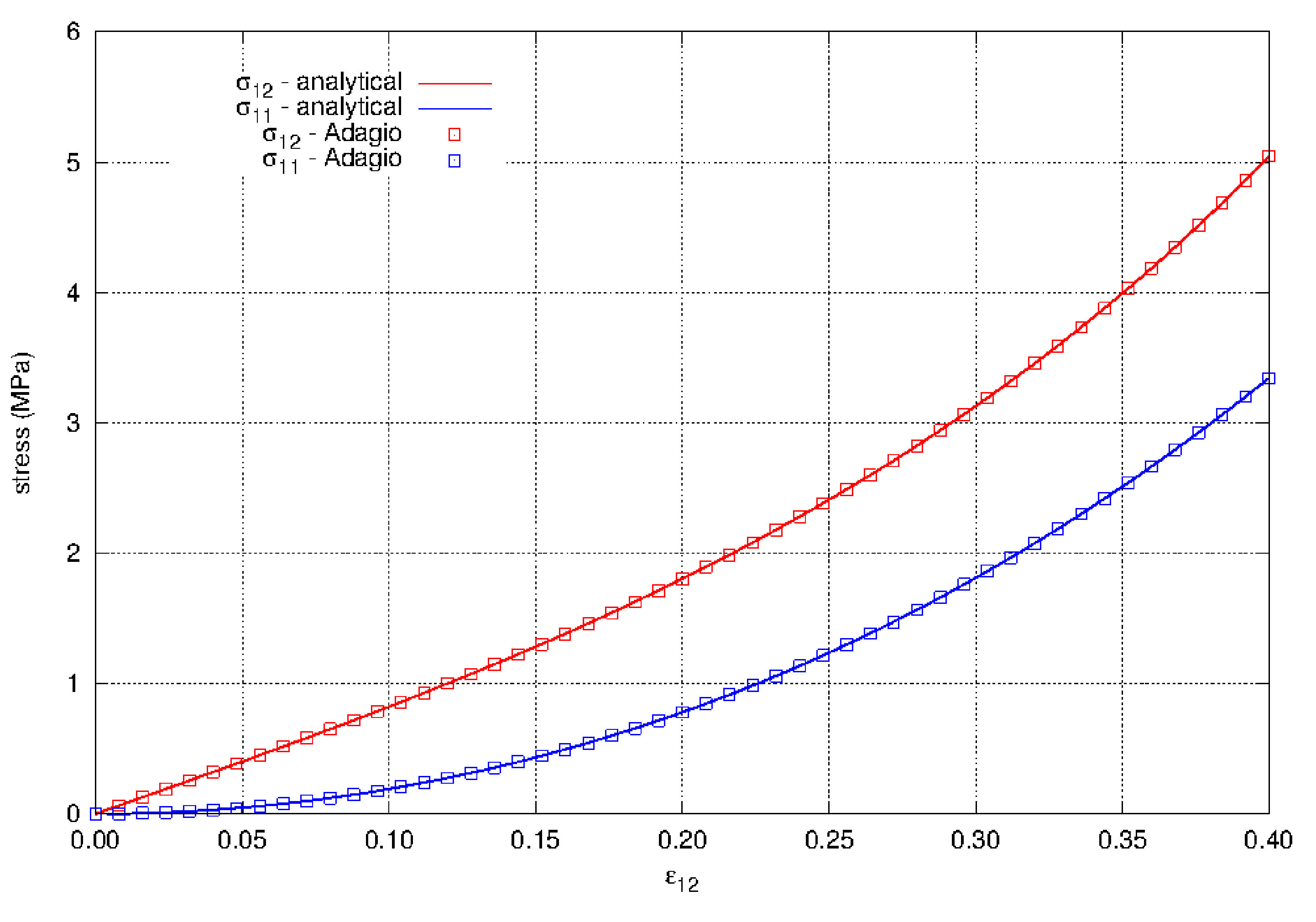 The results of the analysis in pure shear are shown in Fig. 4.111. A single element is strained to a shear strain of \(\varepsilon = 0.4\). The model in Adagio shows agreement with the analytical solution presented above. It is interesting to note that pure shear strain produces not only normal stresses with the hyperfoam model, but a non-zero pressure. The deviatoric/volumetric split so often used with our constitutive model does not occur with the hyperfoam model.