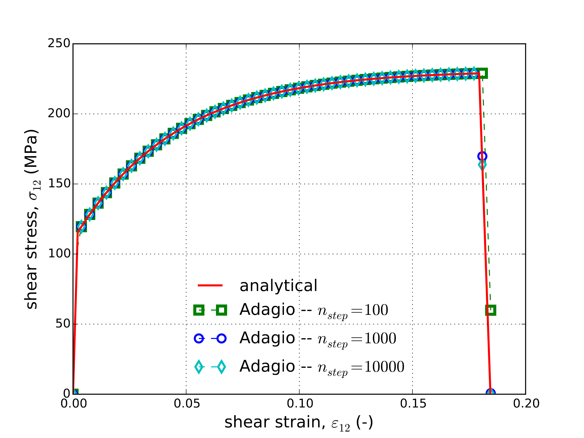 The analysis of the pure shear loading path follows closely with that of the ductile fracture model (Section 4.9.3.2). In this case, pure shear deformations are applied such that the only non-zero stress and strain are \(\sigma_{12}\) and \(\varepsilon_{12}\), respectively. Therefore, during plastic loading