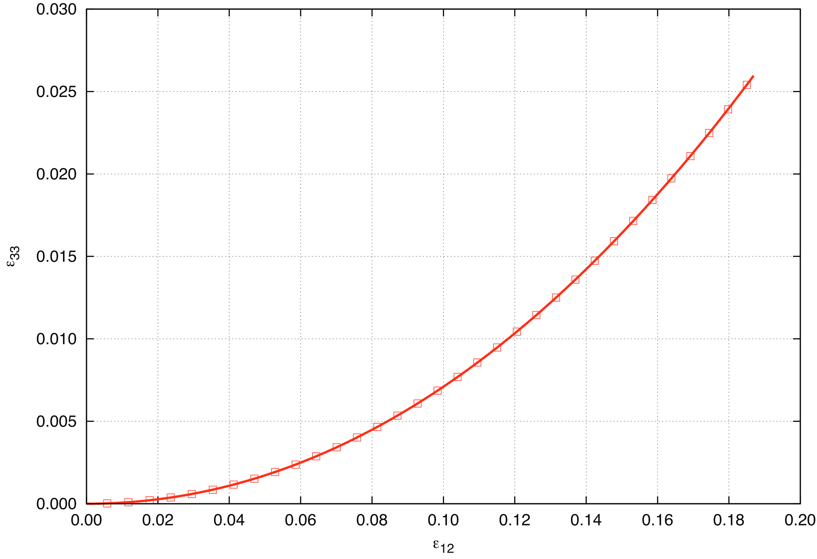 Fig. 4.10 Analytical and numerical results for the neo-Hookean model subjected to a pure shear stress. The curve gives the logarithmic strain component, \(\varepsilon_{33} = \frac{1}{2} \ln B\). The solid lines are the analytical results and the boxes are results from Sierra/SM.
