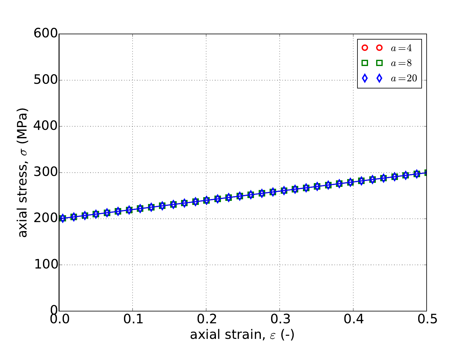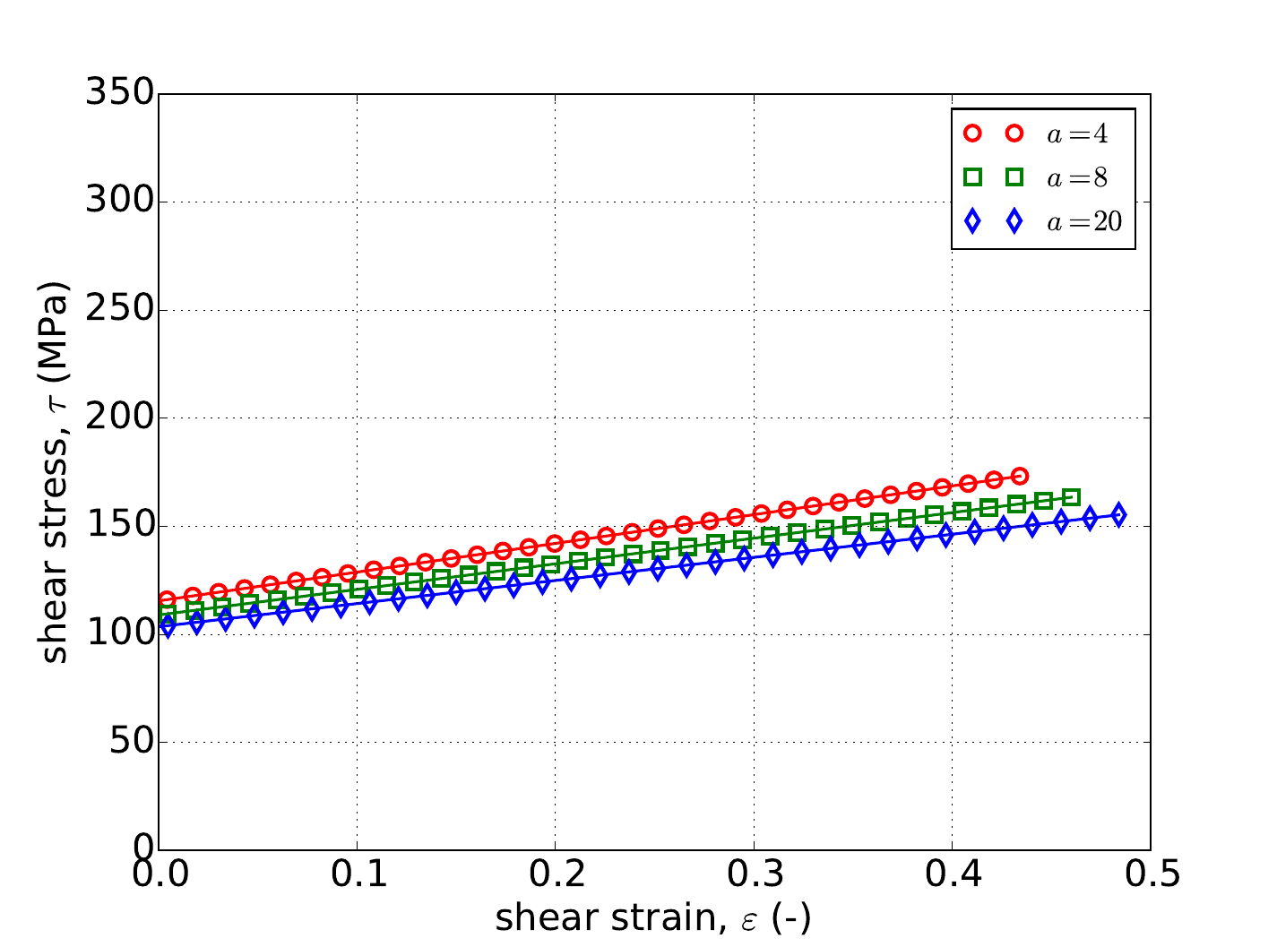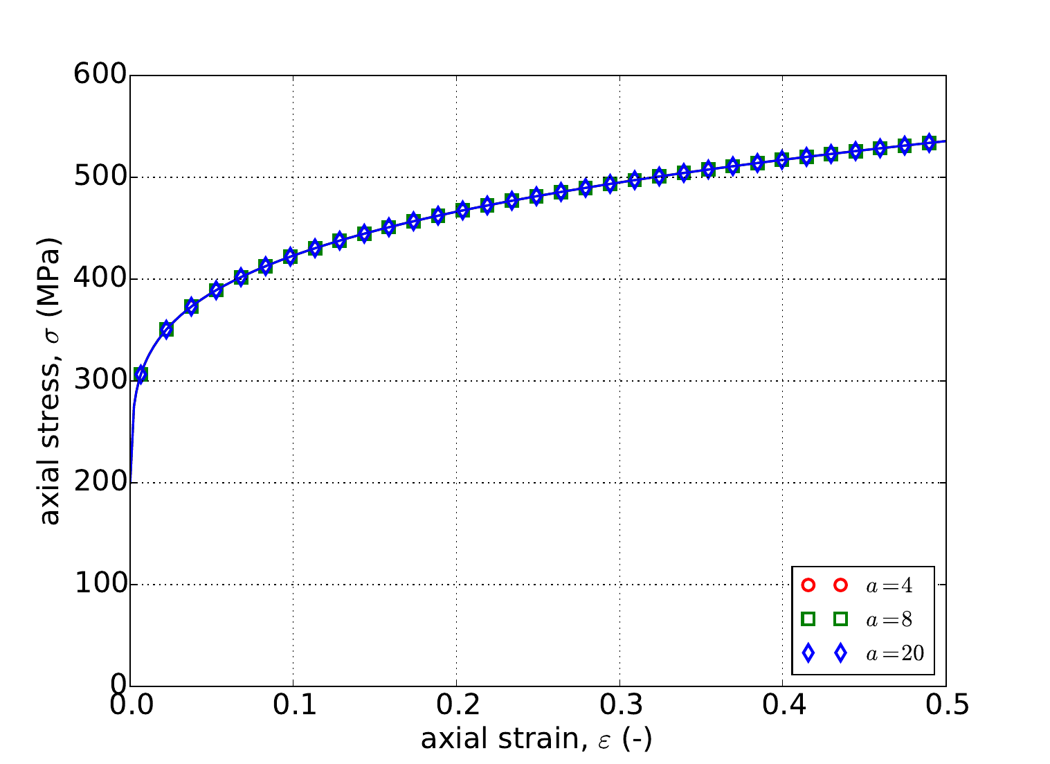 For the rate independent Voce hardening model, the problems of Appendix A are used to verify the model response. Specifically, results for the uniaxial stress and pure shear analyses are presented in Fig. 4.51 as determined analytically and numerically for three different values of \(a\) – \(a=~4,~8,\) and \(20\). From these results, clear agreement is noted between the two sets of results; including the invariance of the uniaxial stress case to \(a\) (Fig. 4.51a). Additionally, the results of Fig. 4.51 also exemplify the saturation nature of the Voce hardening model as the stress-strain response eventually asymptotes.