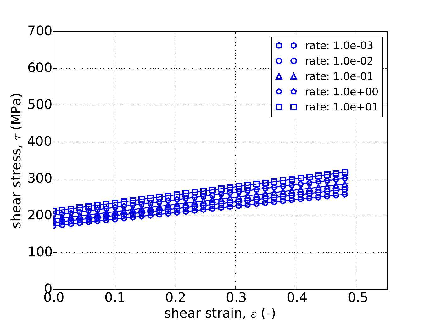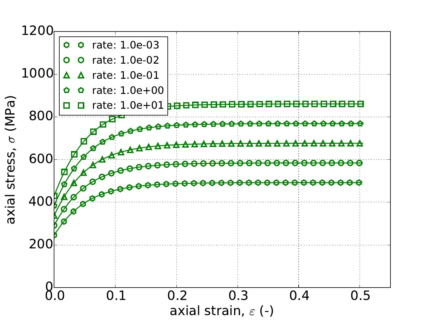 As noted in Section 4.14.3.1, the uniaxial stress response is independent of \(a\). This is also reflected Appendix A in which the stress weighting coefficients (\(\Gamma\)) for the Hosford uniaxial case are one. As such in Fig. 4.52 the results of the constant equivalent plastic strain rate uniaxial stress test are presented with \(a=8\) and using the linear (Fig. 4.52a), power-law (Fig. 4.52b), and Voce (Fig. 4.52c) rate independent hardening models for five different rates – \(\dot{\bar{\varepsilon}}^p=1\times10^{-3},~1\times10^{-2},~1\times10^{-1},~1\times10^{0}\) and \(1\times10^{1}~\text{s}^{-1}\). In all cases in Fig. 4.52 excellent agreement is observed between the results.
