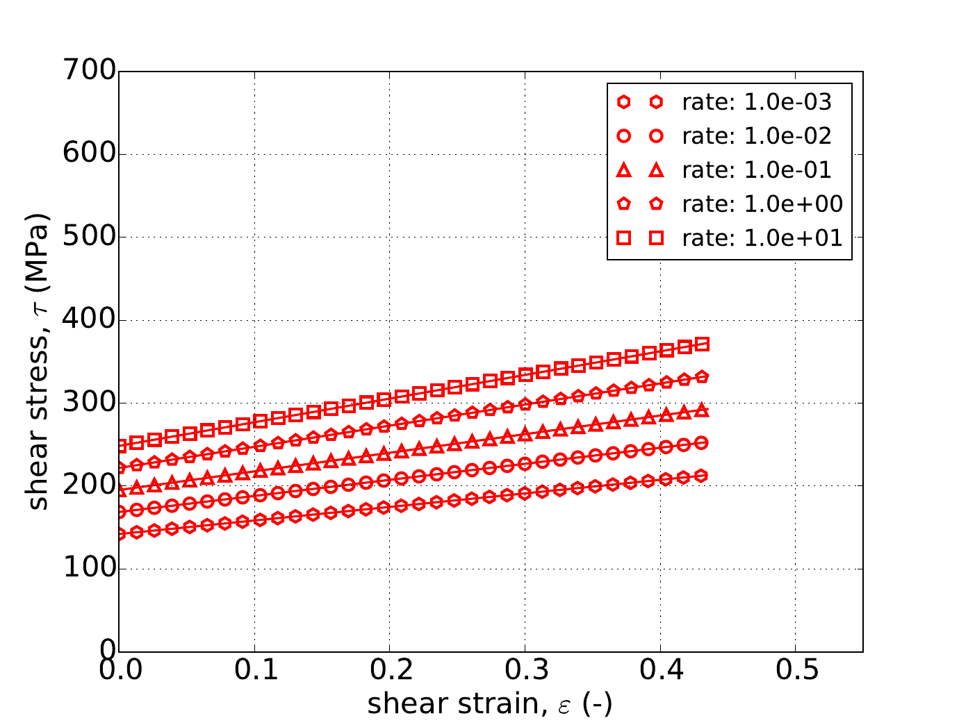 Fig. 4.54 Stress-strain response of the Hosford plasticity model with rate dependent, Johnson-Cook type hardening in pure shear with (a-c) Voce rate independent hardening. Solid lines are analytical results while open symbols are numerical.