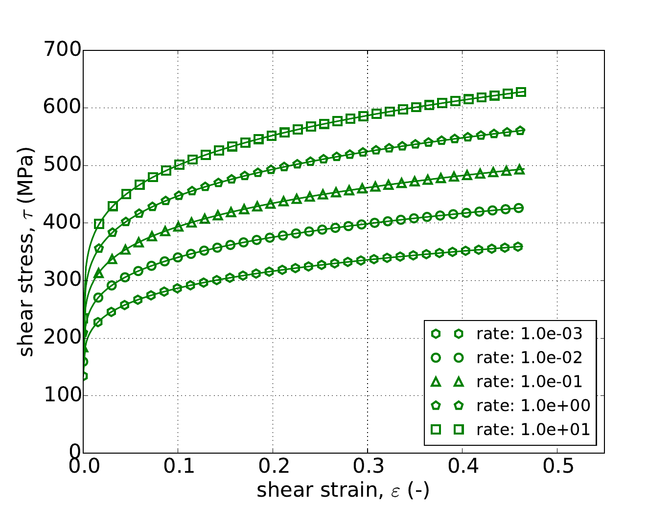 Fig. 4.57 Stress-strain response of the Hosford plasticity model with rate dependent, power-law breakdown type hardening in pure shear with (a-c) Voce rate independent hardening. Solid lines are analytical results while open symbols are numerical.