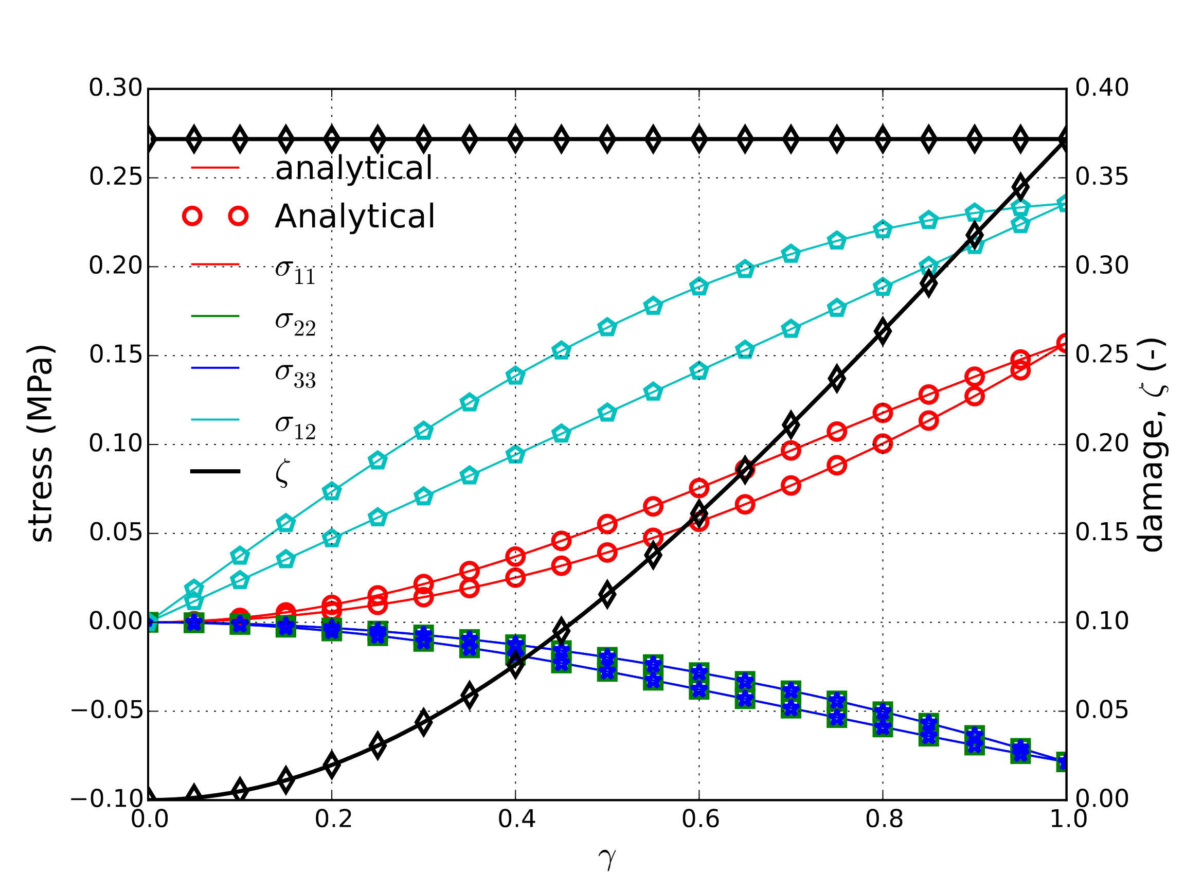Fig. 4.114 Analytical and numerical results of the stress and damage state for the simple shear case.