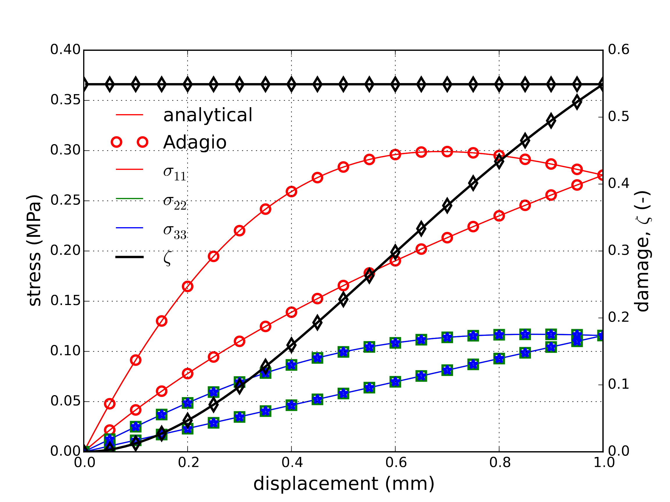 Fig. 4.113 Analytical and numerical results of the stress and damage state for the uniaxial stretch case.
