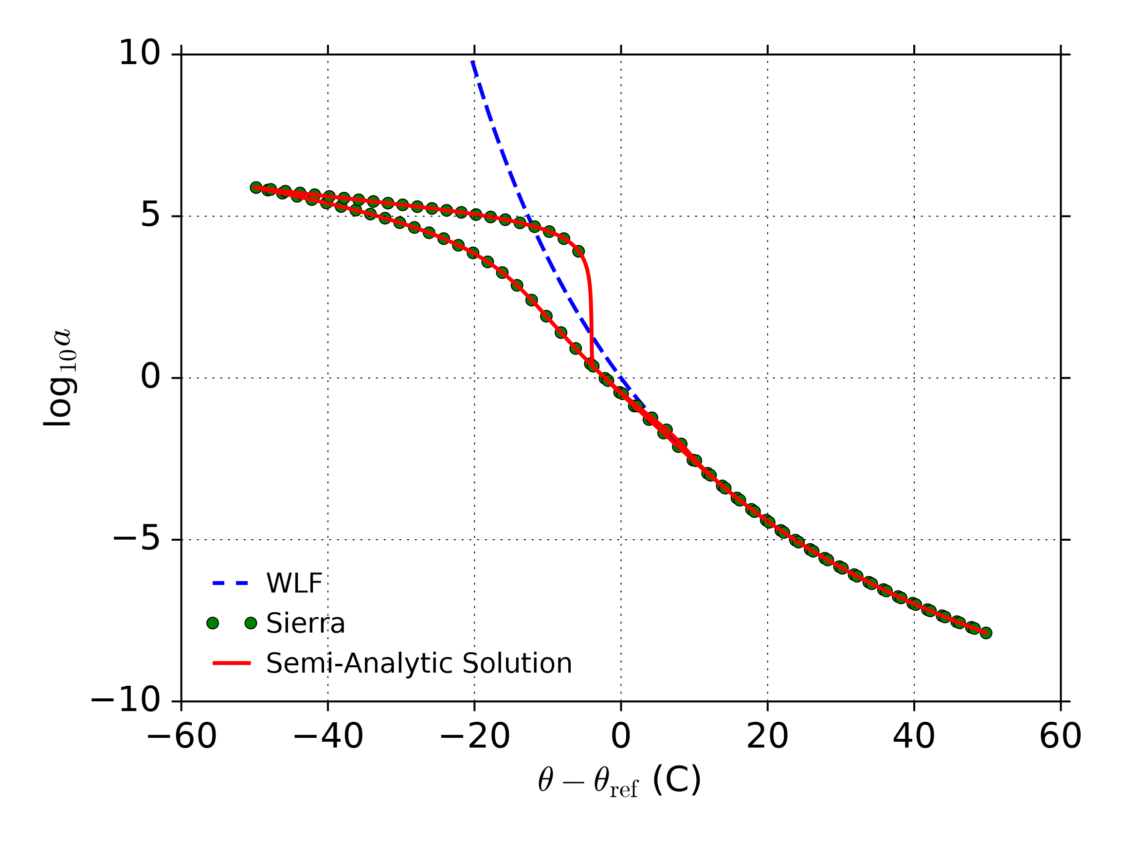 Fig. 4.138 Time-temperature dependence of the shift factor, \(a\), during cooling through the glass transition and then reheating back through it. The cooling/heating rate is 1\(^{\circ}\)C per minute. FEA (circles) show the expected WLF (blue dashed line) behavior for \(\theta-\theta_{\text{ref}} > 0\). The UPM model departs from WLF behavior below the reference temperature as expected, and continues to agree with an external to Sierra numerical scheme (solid line) to simulate this boundary value problem.